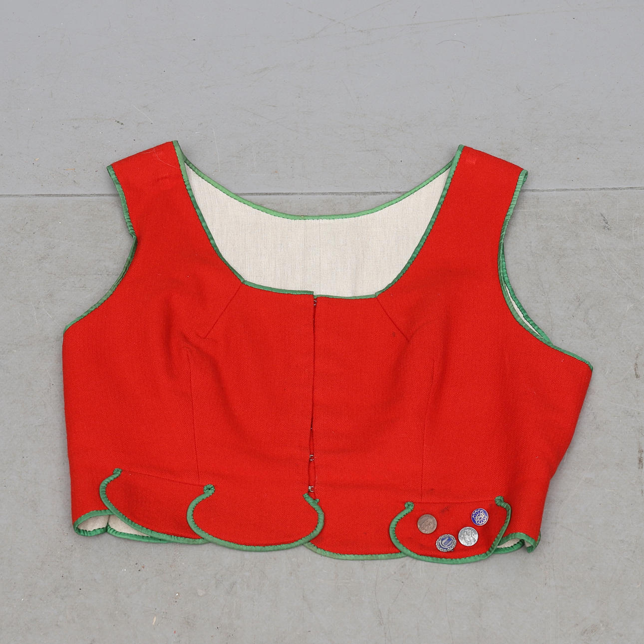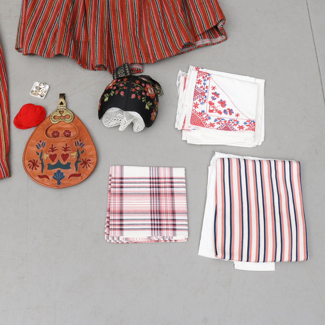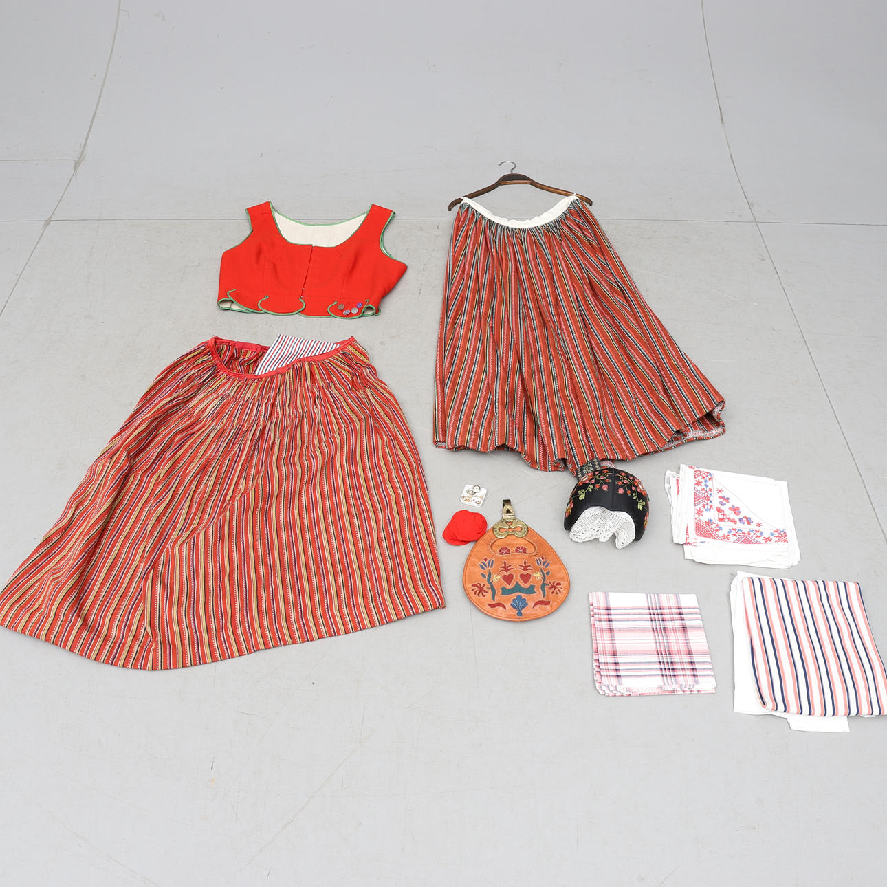 Med b.la. väst, förkläde, två kjolar, sjalar, blus, väska, hätta samt dräktspänne i silver. Västens mått, armhåla till armhåla ca 53 cm.