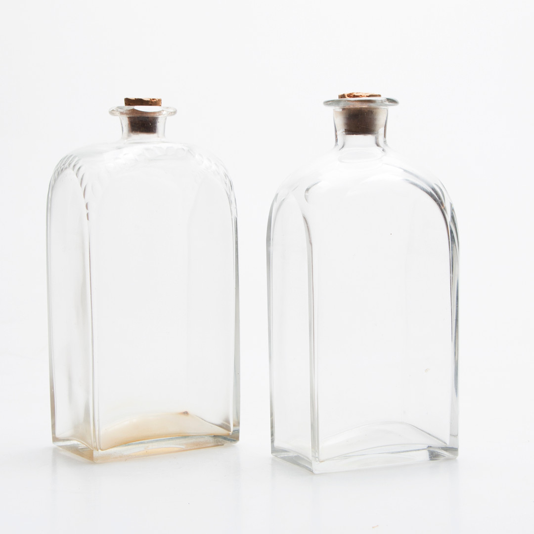 1422107. FLASKSCHATULL, trä, med 2 FLASKOR, glas, 1800-tal.