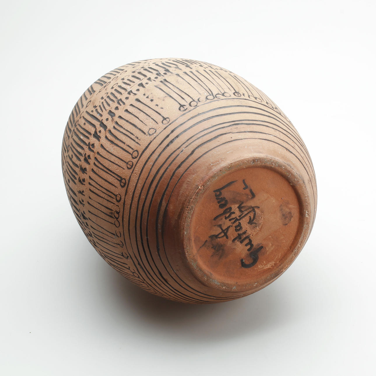 Ristad geometrisk dekor i svart samt delvis glaserad i blått. Höjd 38 cm.