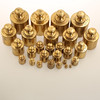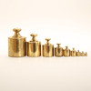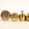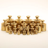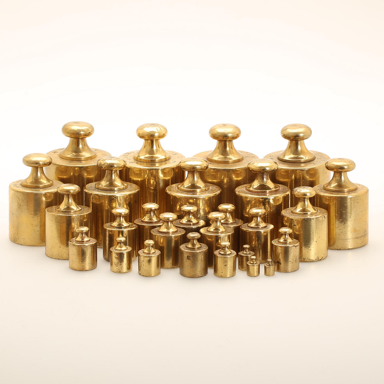 VIKTER, 27 stycken, krönta, mässing. TRÄLÅDA.
