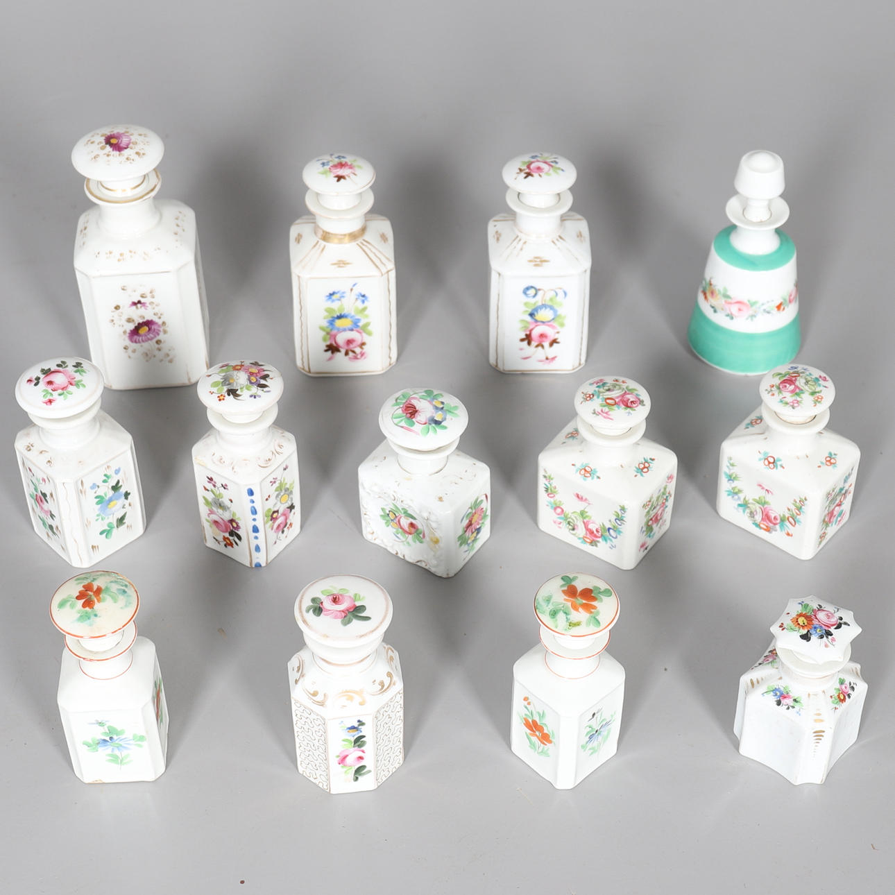 mitten till slutet av 1800-talet, var och en olika målade med blommor, några med förgyllda och gjutna detaljer, högsta 19 cm, (13).