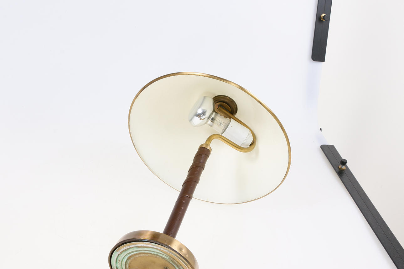 Bordslampa med läderlindat skaft, mässingsfot, skärmens diameter 30, höjd 45 cm.