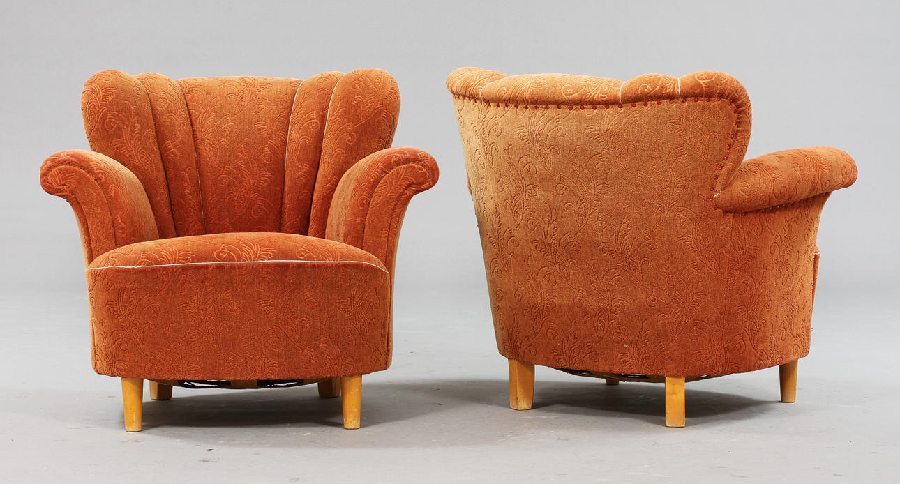 Soffa samt 2 fåtöljer. Klädd i terrakottafärgad plysh. Soffans längd 180 cm.