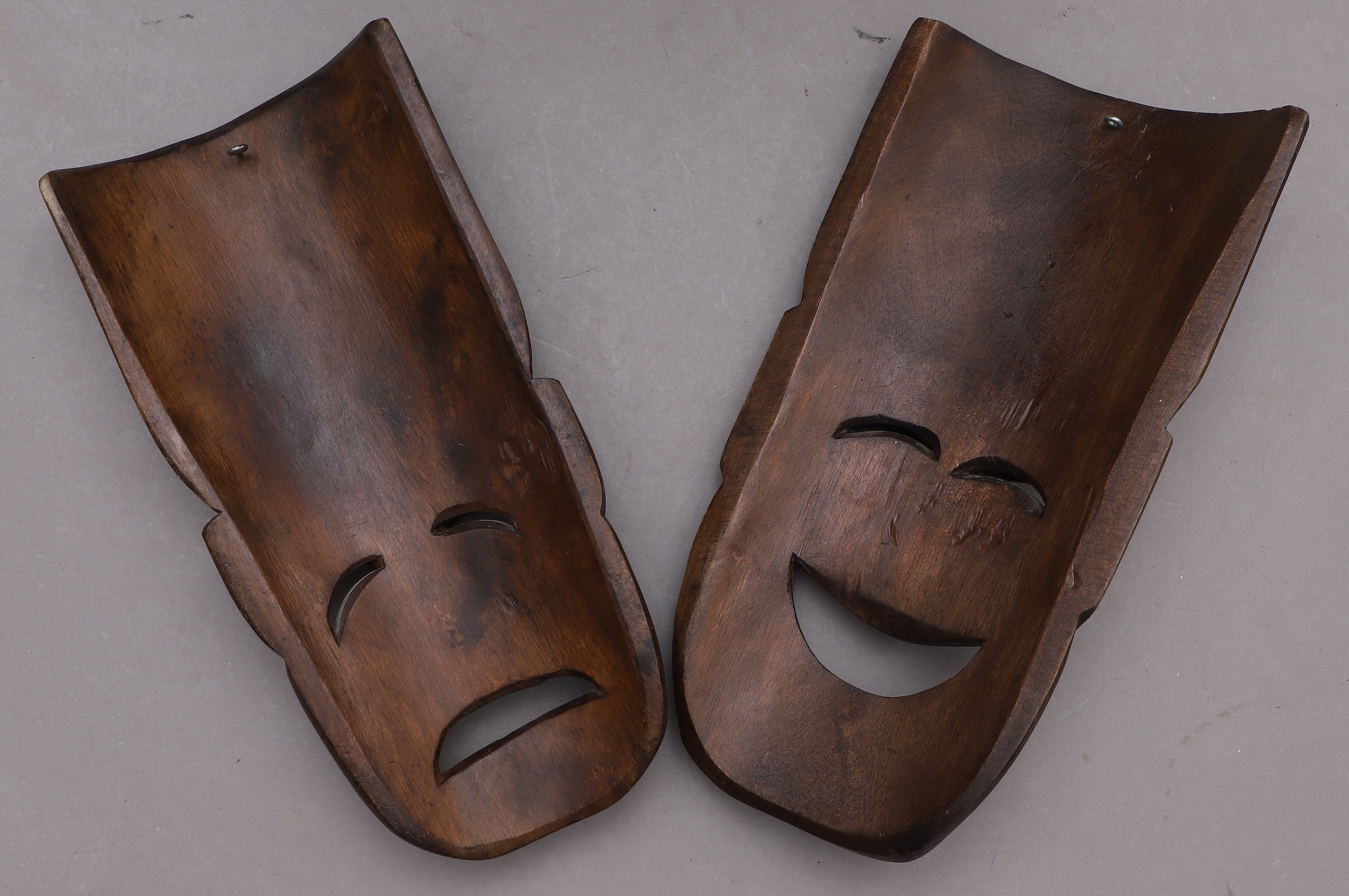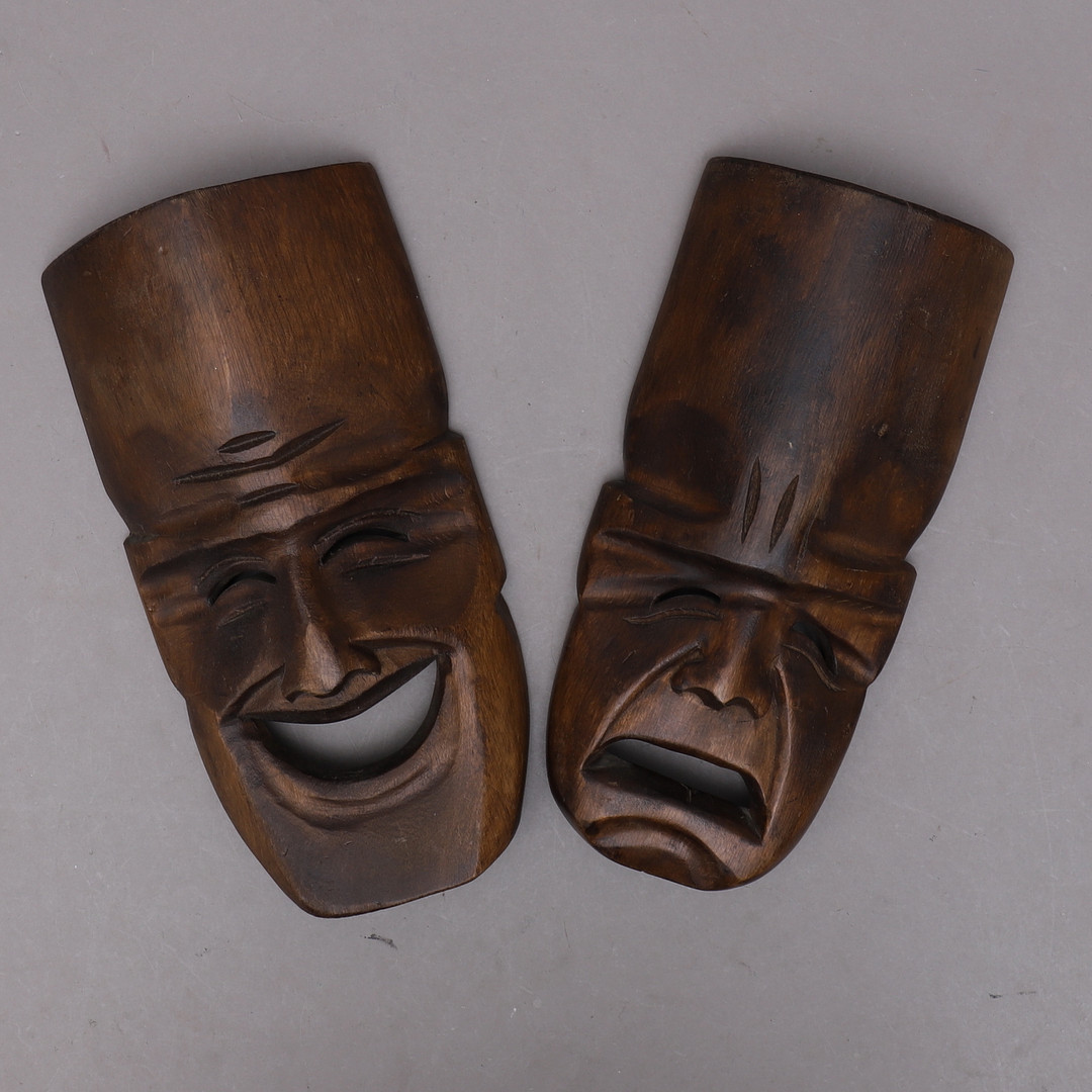1433528. MASKER, 2 st, trä, glad & ledsen.