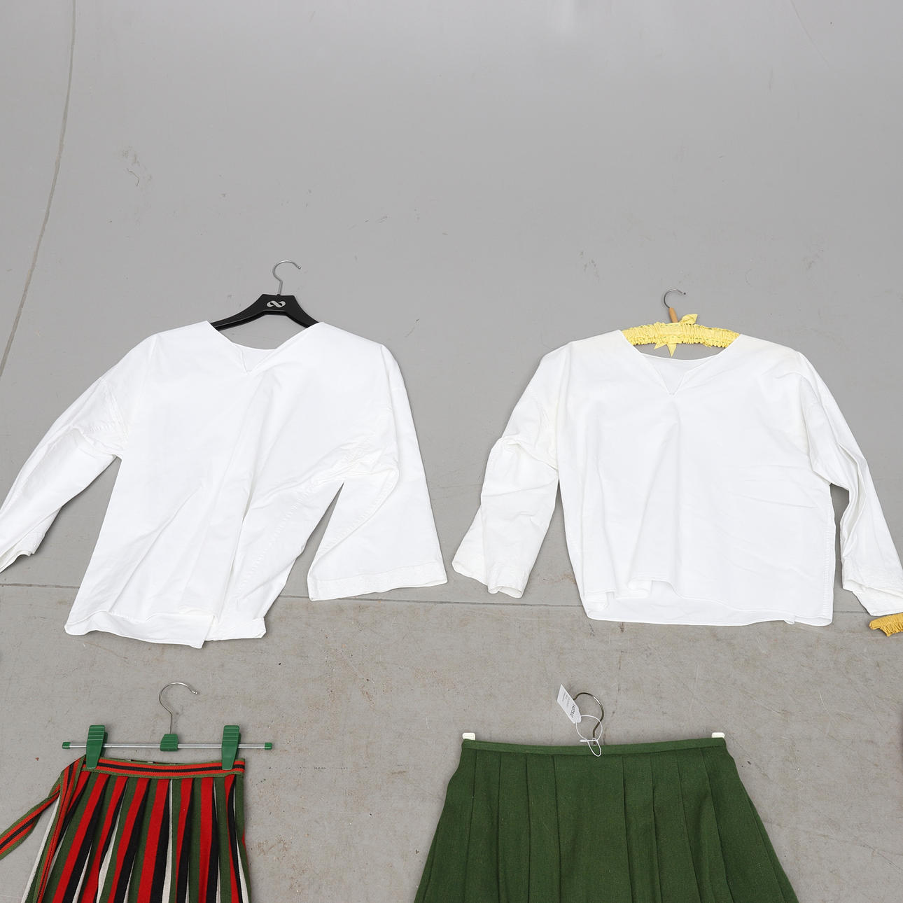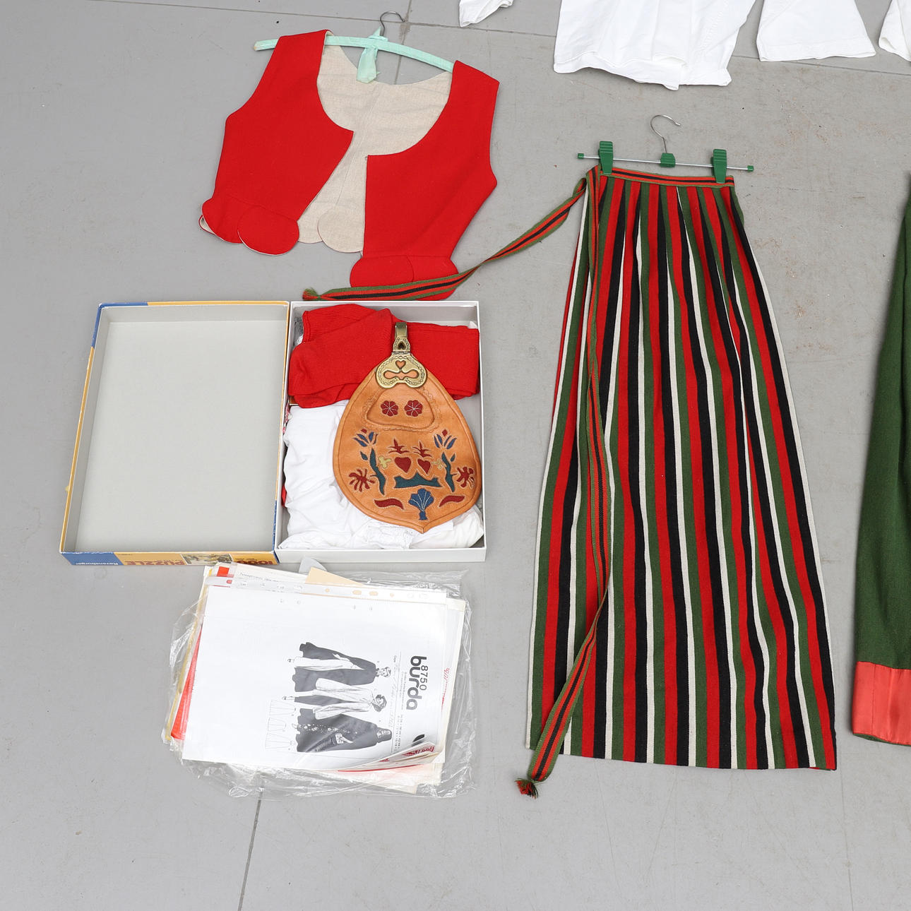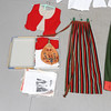 Bland annat kjol, förkläde, sjalar, 2 blusar, 2 västar, 2 par strumpor, 2 par skor, väska samt brosch i silver.