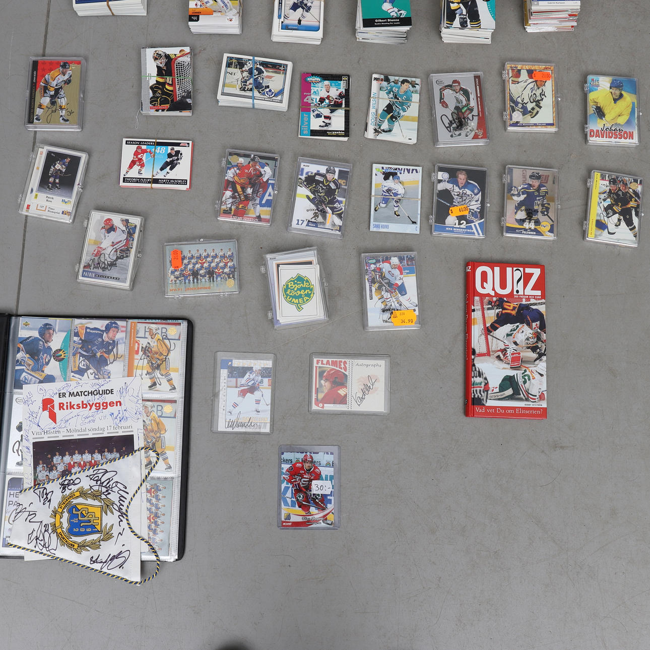 Pärm med HV71 kort samt signerad vimpel. Signerad vimpel Södertälje, samt signerad blad Vita hästen.