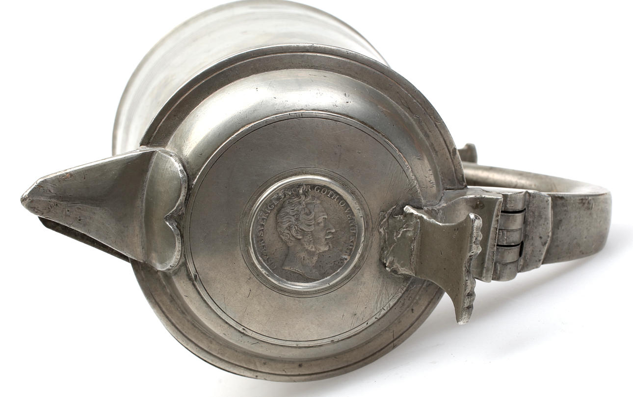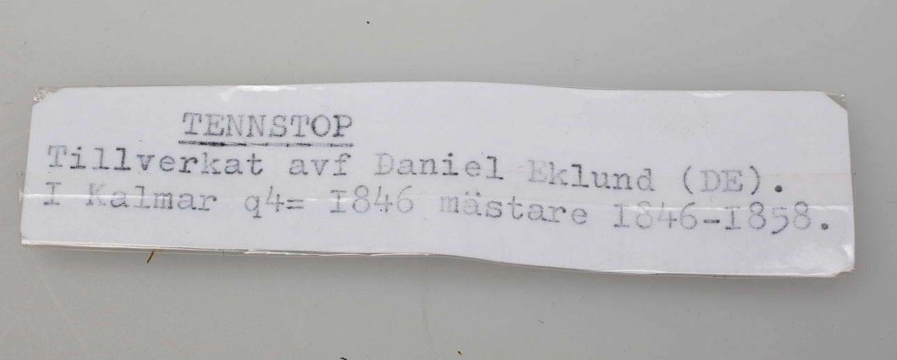 Stopet stämplat Daniel Eklund, Kalmar 1846, Höjd 20 cm Fatet stämplat Johan Petter Fagerström, Kalmar 1823 Diameter 28 cm.