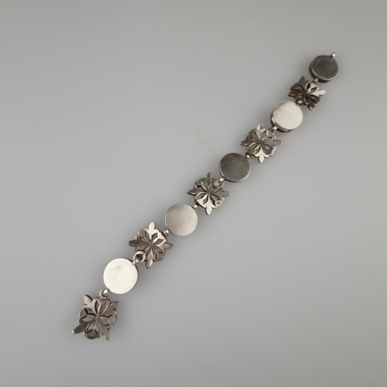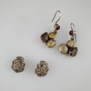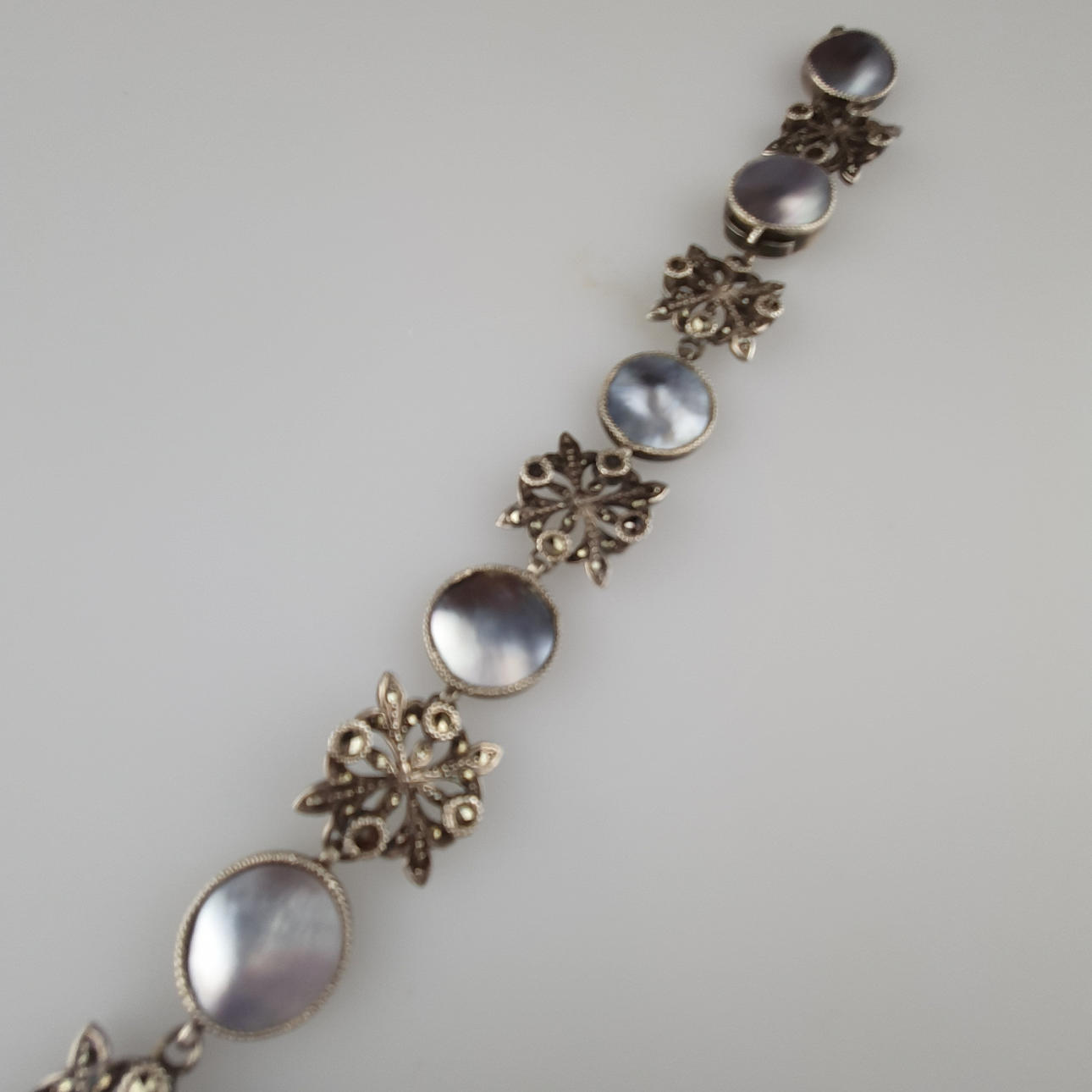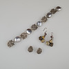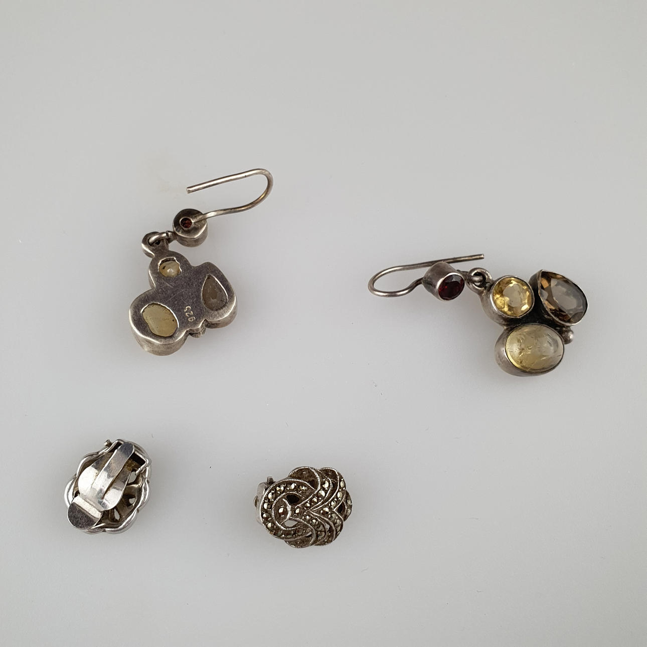 1x armband, runda element med etsade pärlplattor omväxlande med genombrutna länkar med markasit trim, L.CA.18cm, lås trasigt, 1x par öronklämmor med markasit trim, L.CA.15mm, 1x par örhängen med halvädelstenar (inklusive citrin, rökkvarts), L.CA.35mm, totalvikt ca 42g.