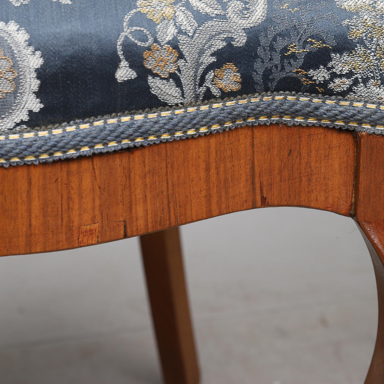 Fanerade med valnöt. Genombruten rygg. Fast stoppad rygg och sits. Höjd ca 81 cm.