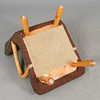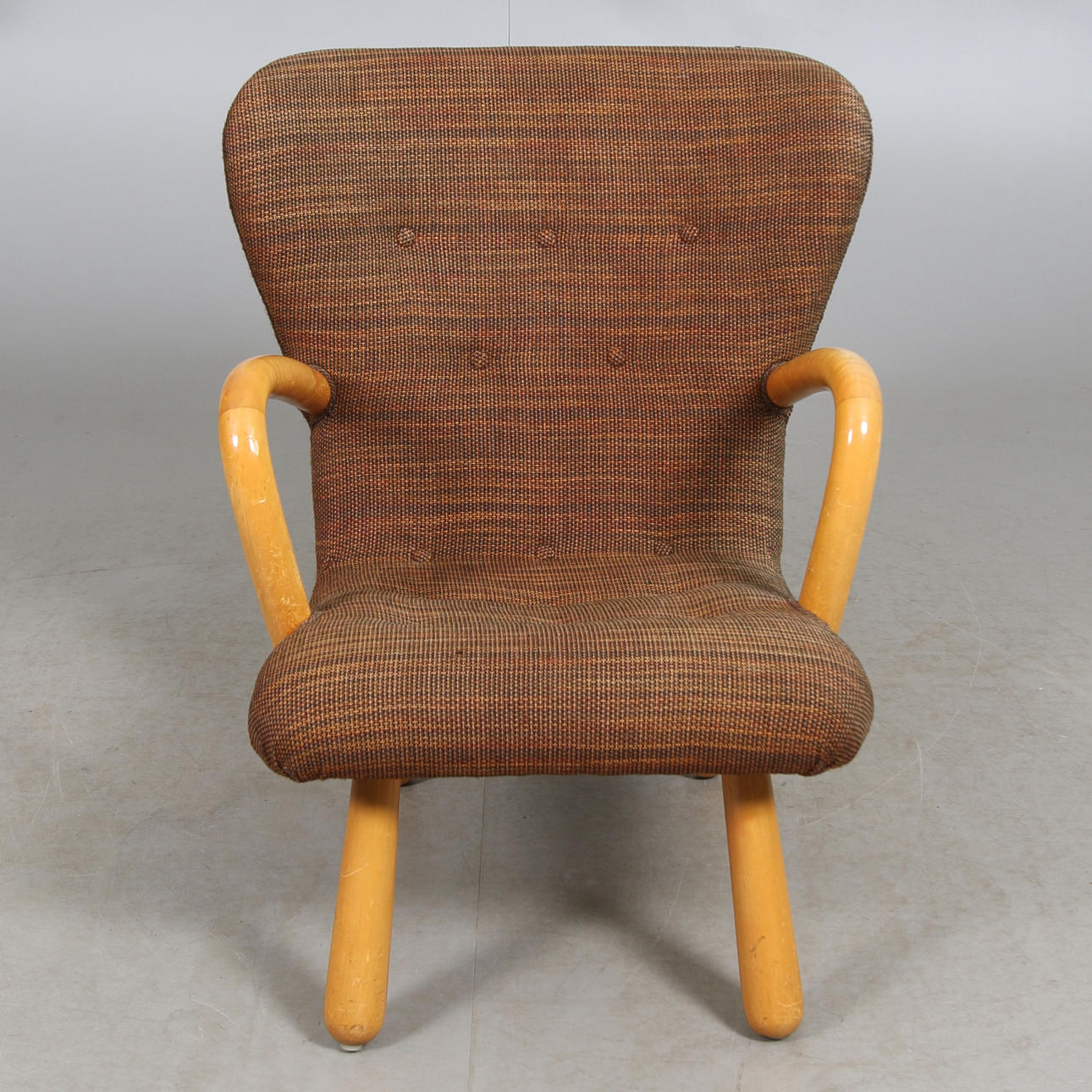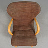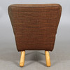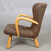 Djuphäftat sitts och rygg. Ben och armlän av björk. Längd ca. 66, bredd 68, sitthöjd 39, rygghöjd 79 cm.