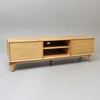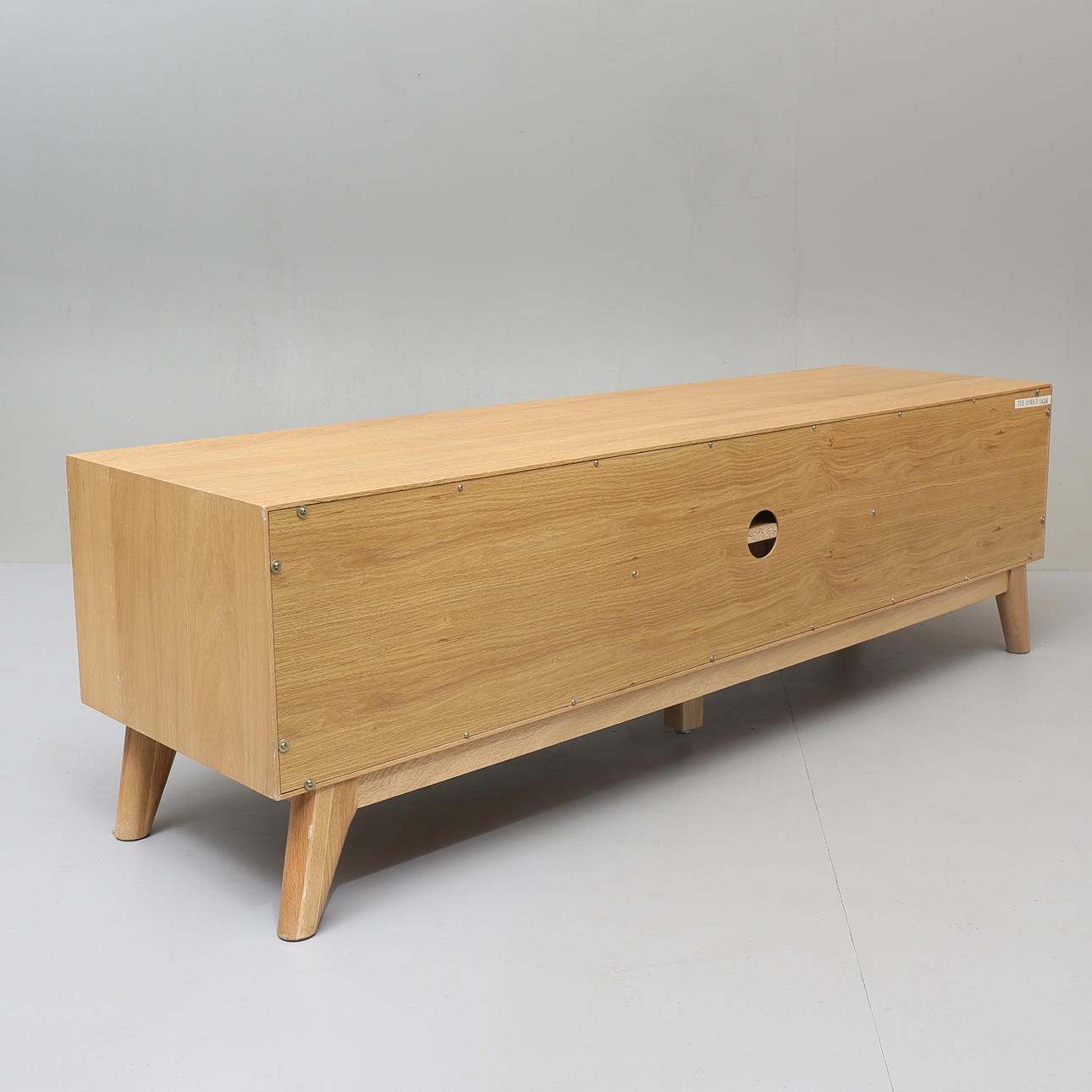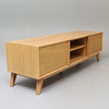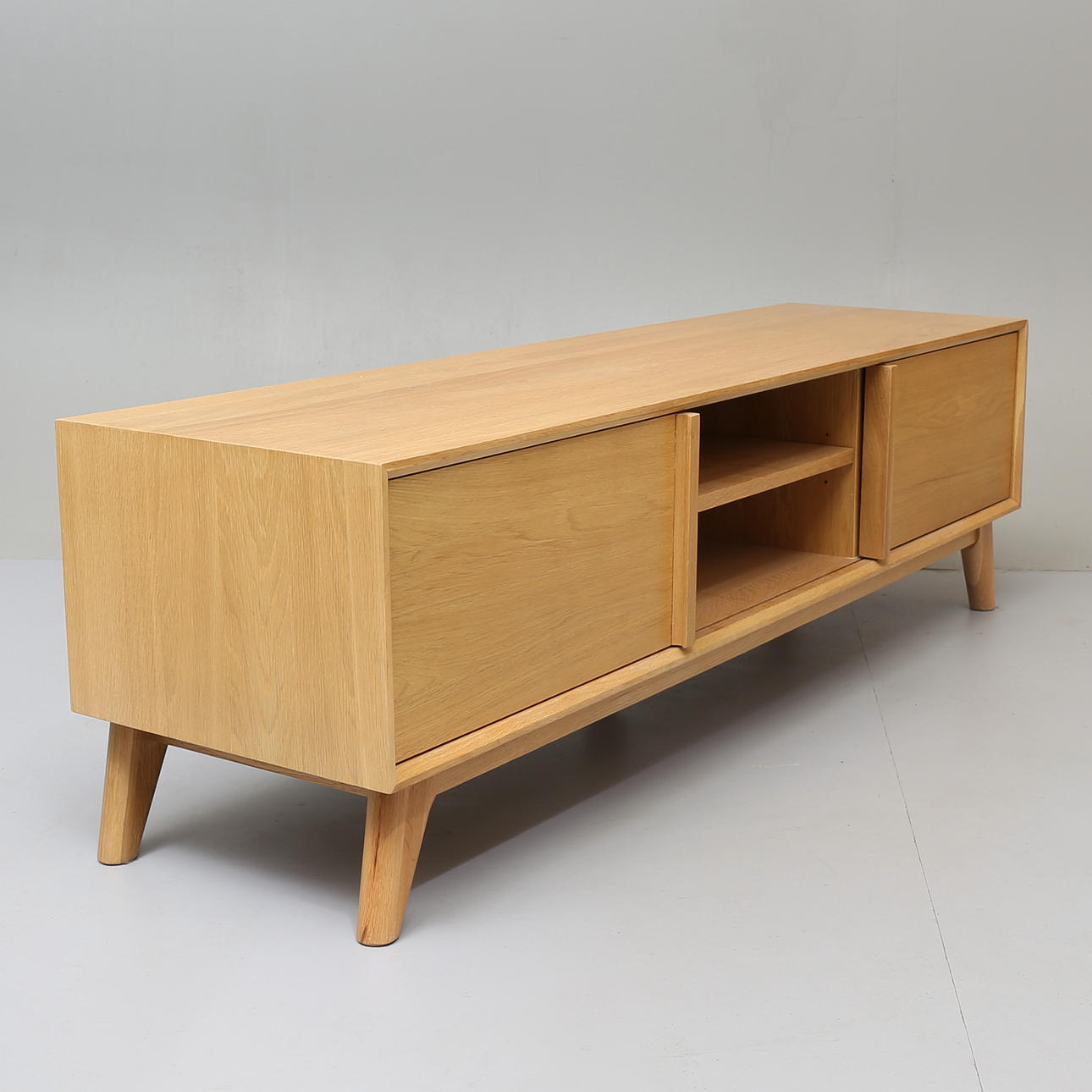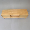 Tredelad bänk med förskjutbara luckor, två tomma lådfack till vänster och höger, i mitten med en hylla.