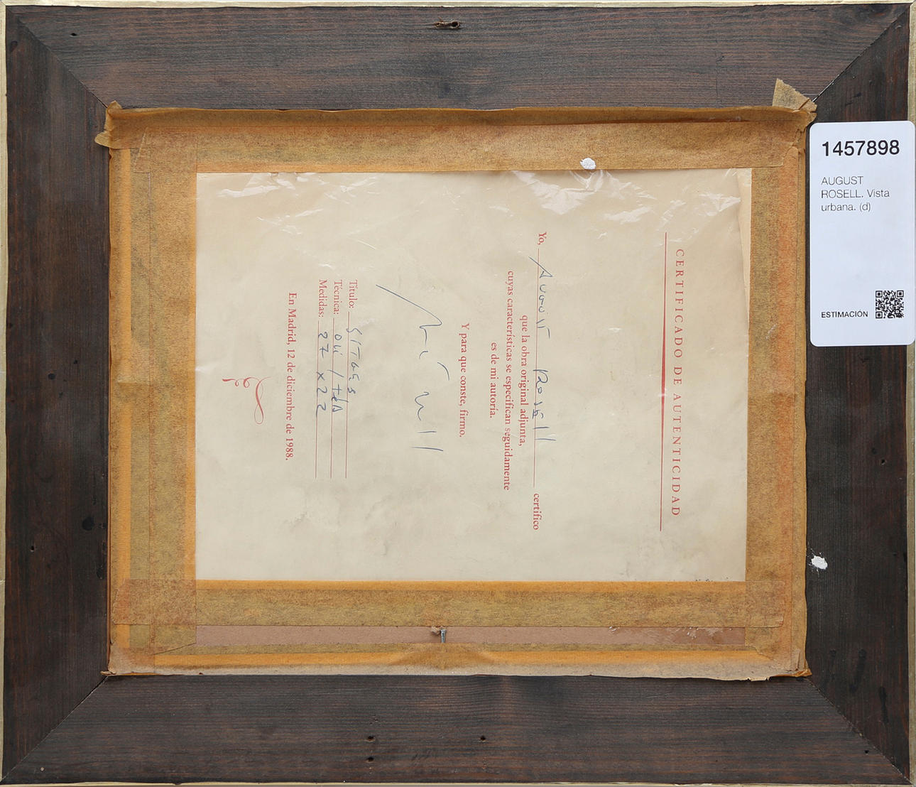 Signerad. På baksidan, äkthetsintyg undertecknat av konstnären i Madrid den 12 december 1988