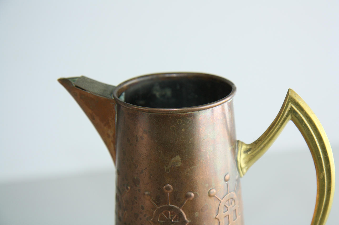 Ålders och bruksslitage, pipen intryckt på en sida, lockets gångjärn sitter inte fast i stopet.