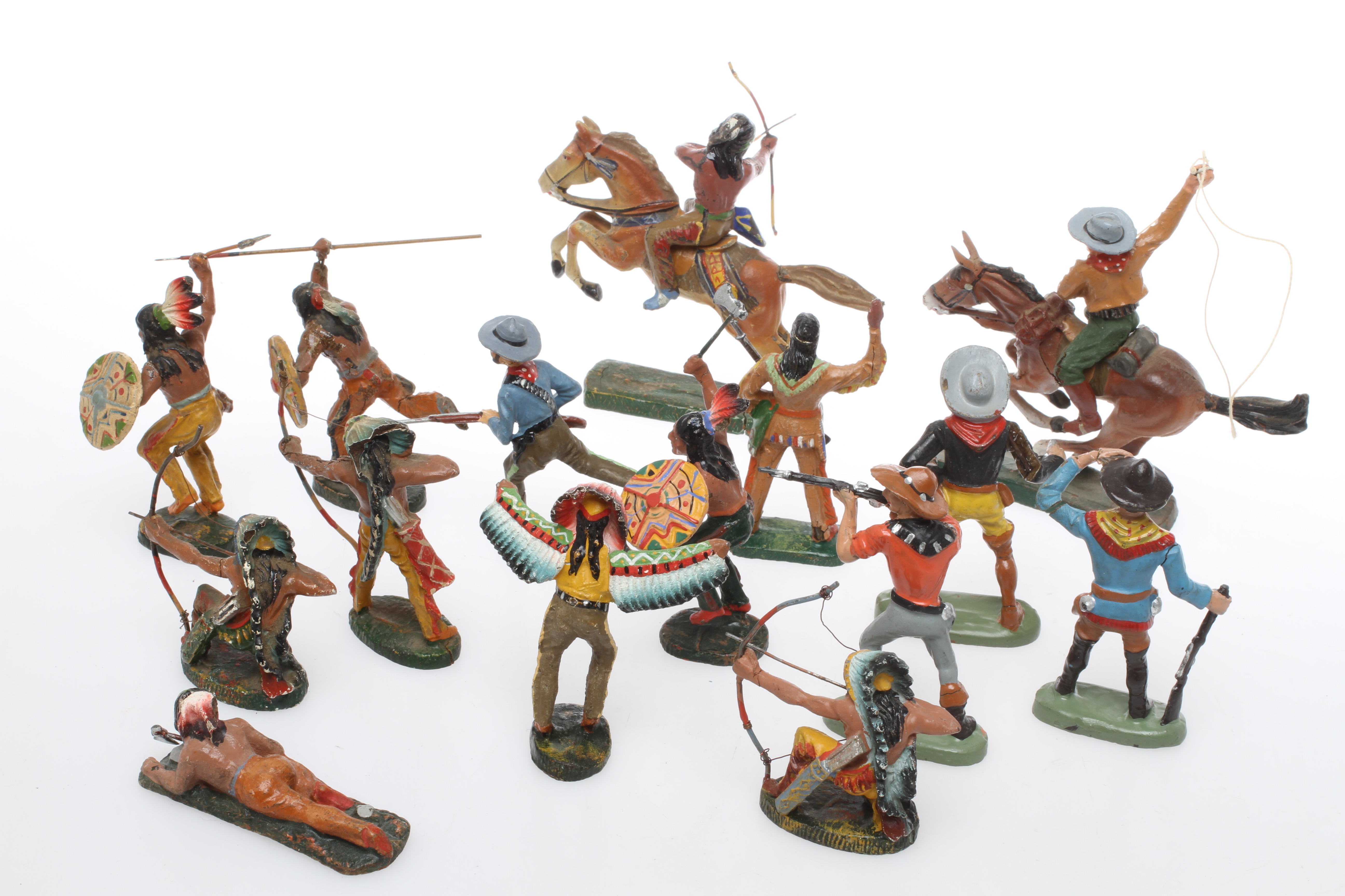 145869. ELASTOLIN 12 WESTERNFIGURER samt 3 LEYLA.