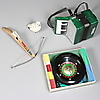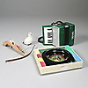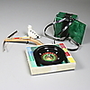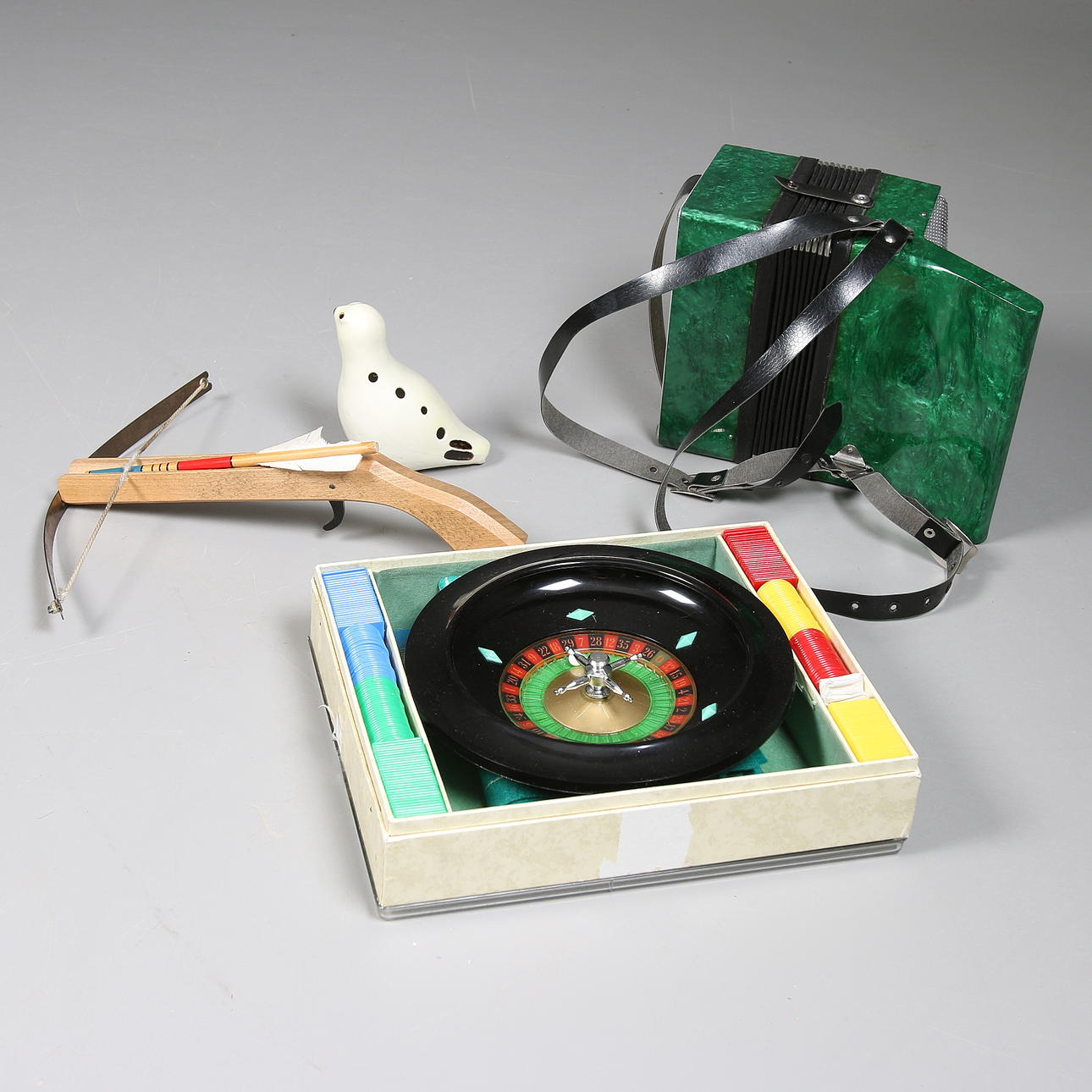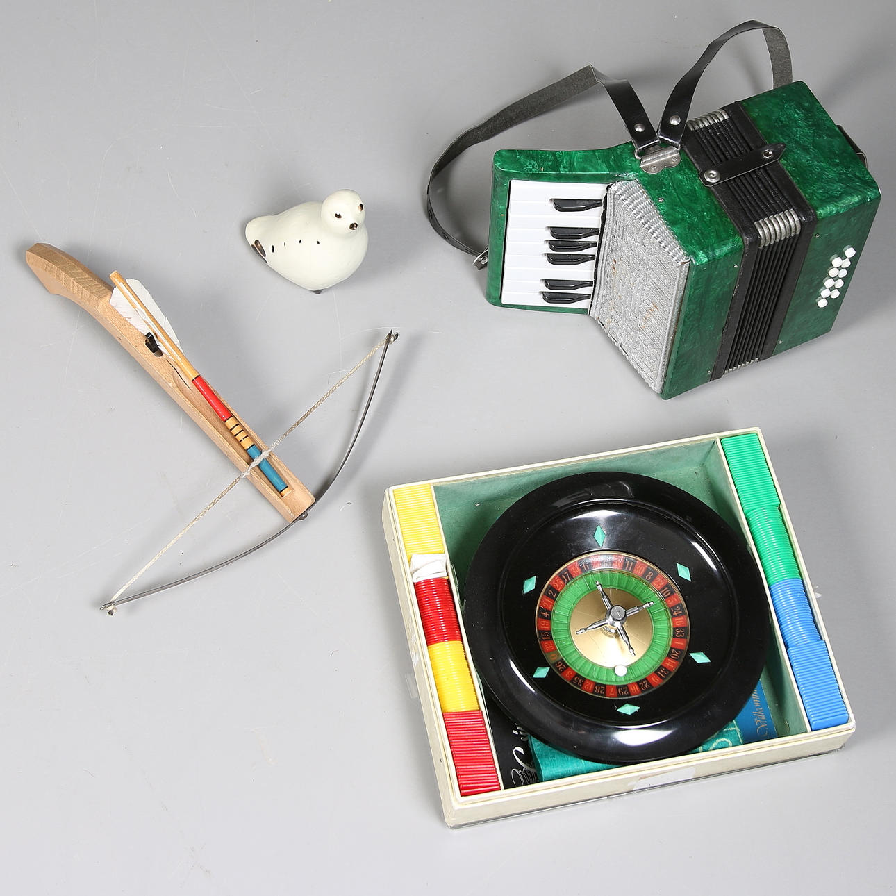 Grönt dragspel, längd 19 cm. Armborst med pil, trä, längd 23 cm. Roulettehjul med kula, med spelplan, marker och regler. Lergök.
