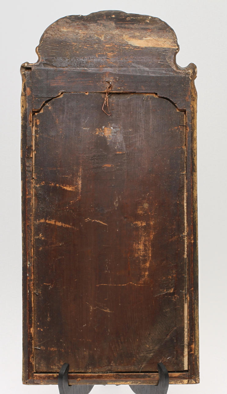 Förgylld och bronserad dekor. Rak ram samt svängt och skuret överstycke krönt av rocaille. Originalbakstycke. Höjd 52,5 cm.