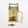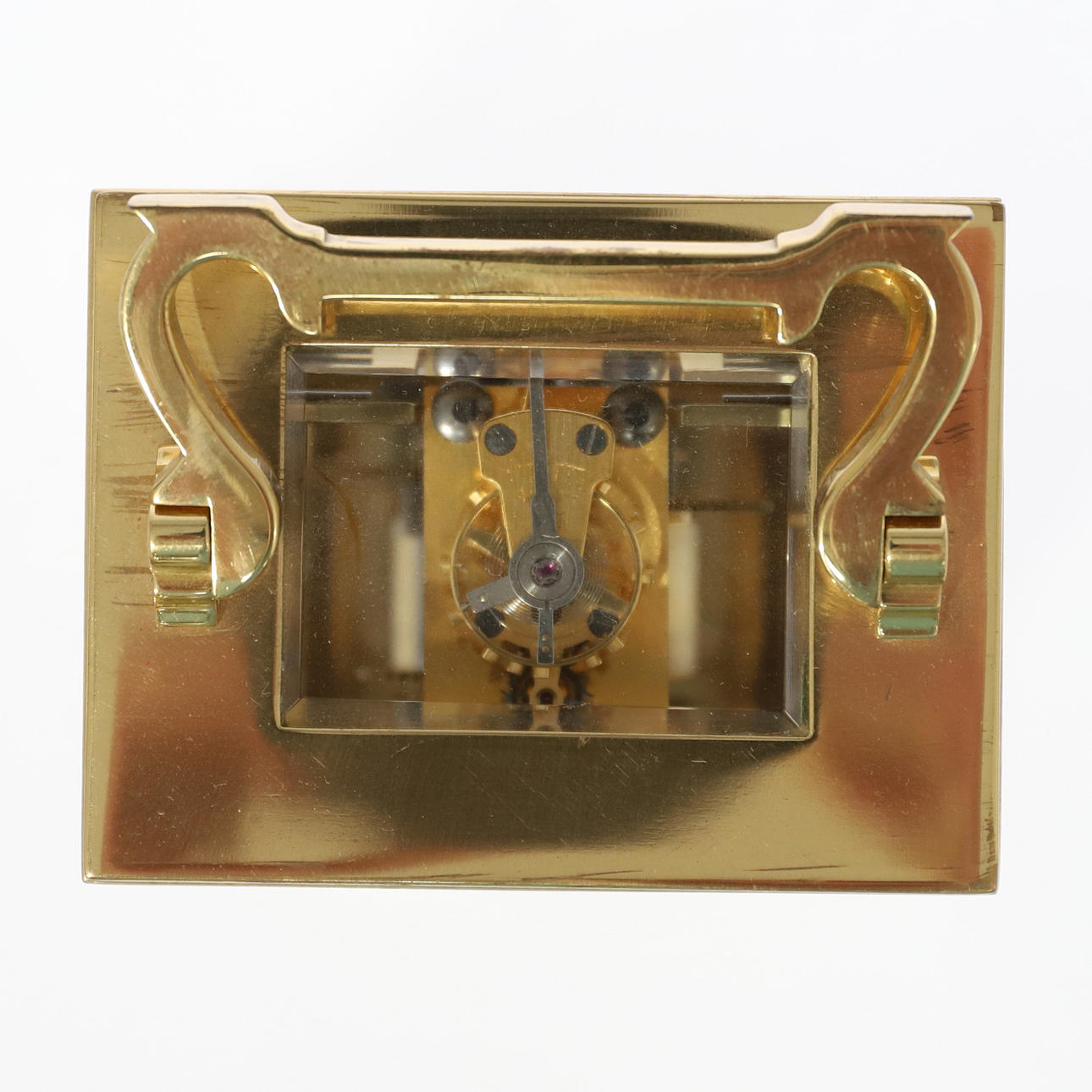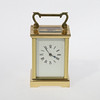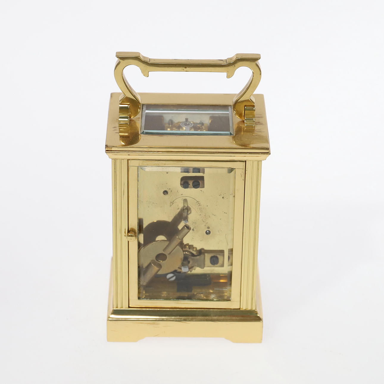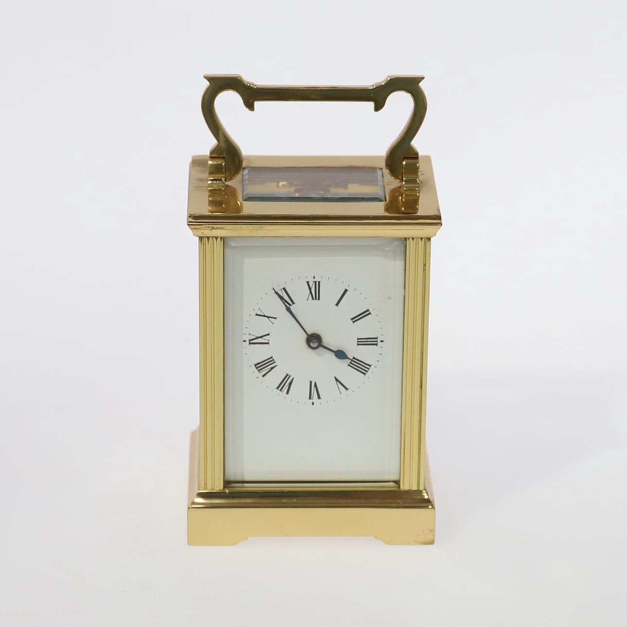 circa 1920-1930, vitmålad urtavla med romerskt kapitel, mässingsplatta 8 dagars rörelse med juvelerad plattformsgång, i ett fodral med gjutna stolpar, och format bärhandtag,