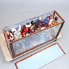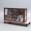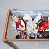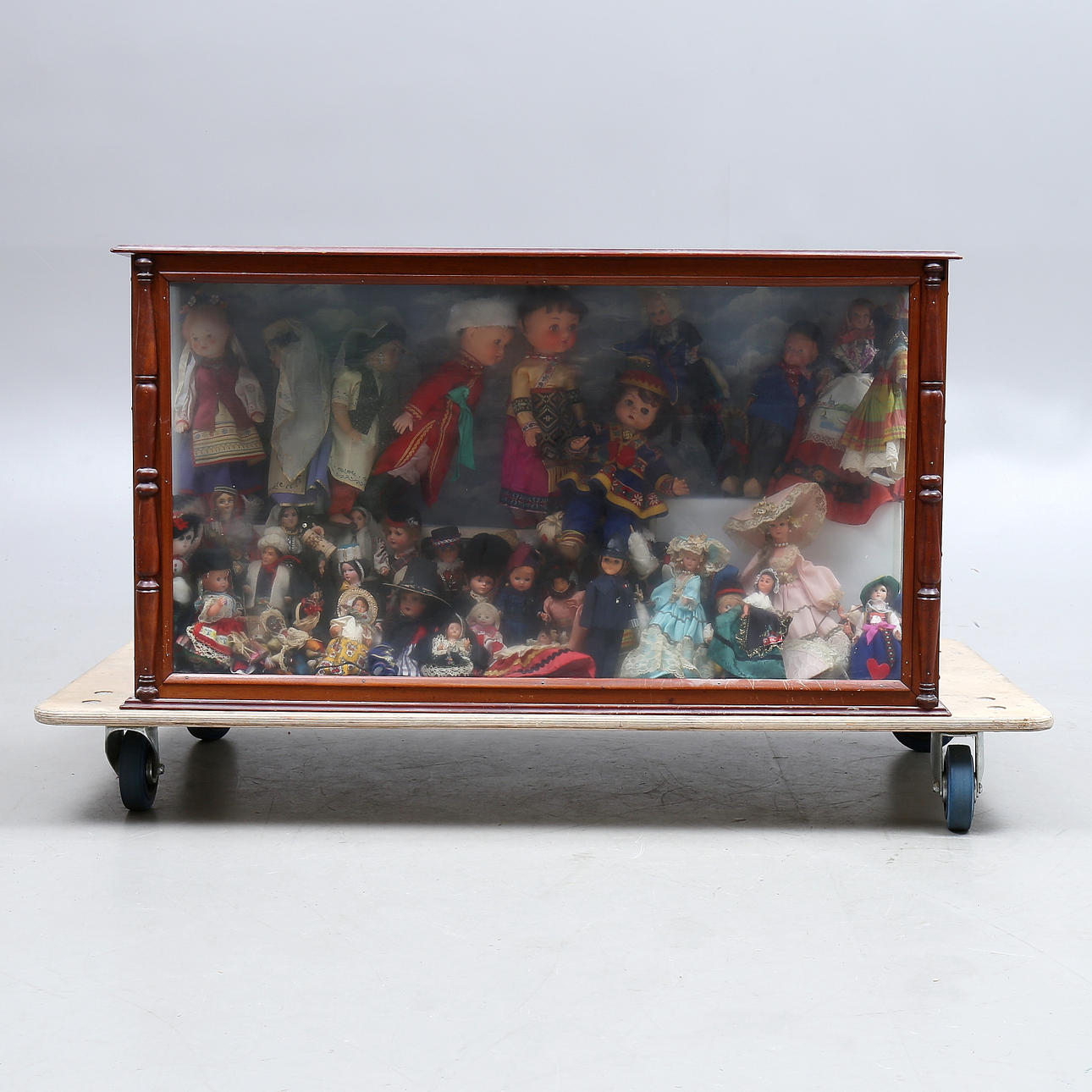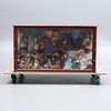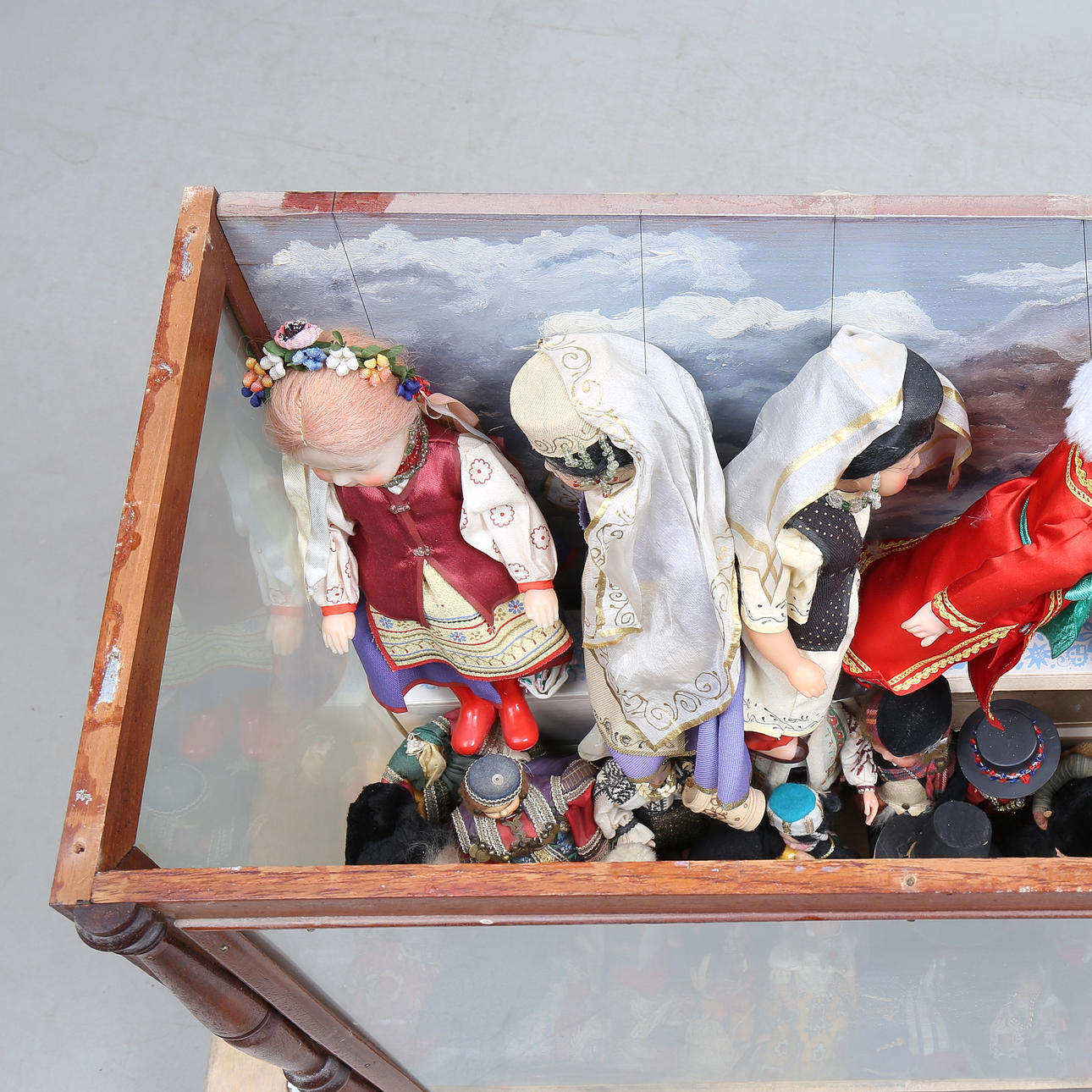 Slitage, repor, stötmärken, ytsmuts. Omarbetat. Dock delvis fastnålade. Bakstycke med bemålning. Smärre skador. Dockor ej genomgångna.