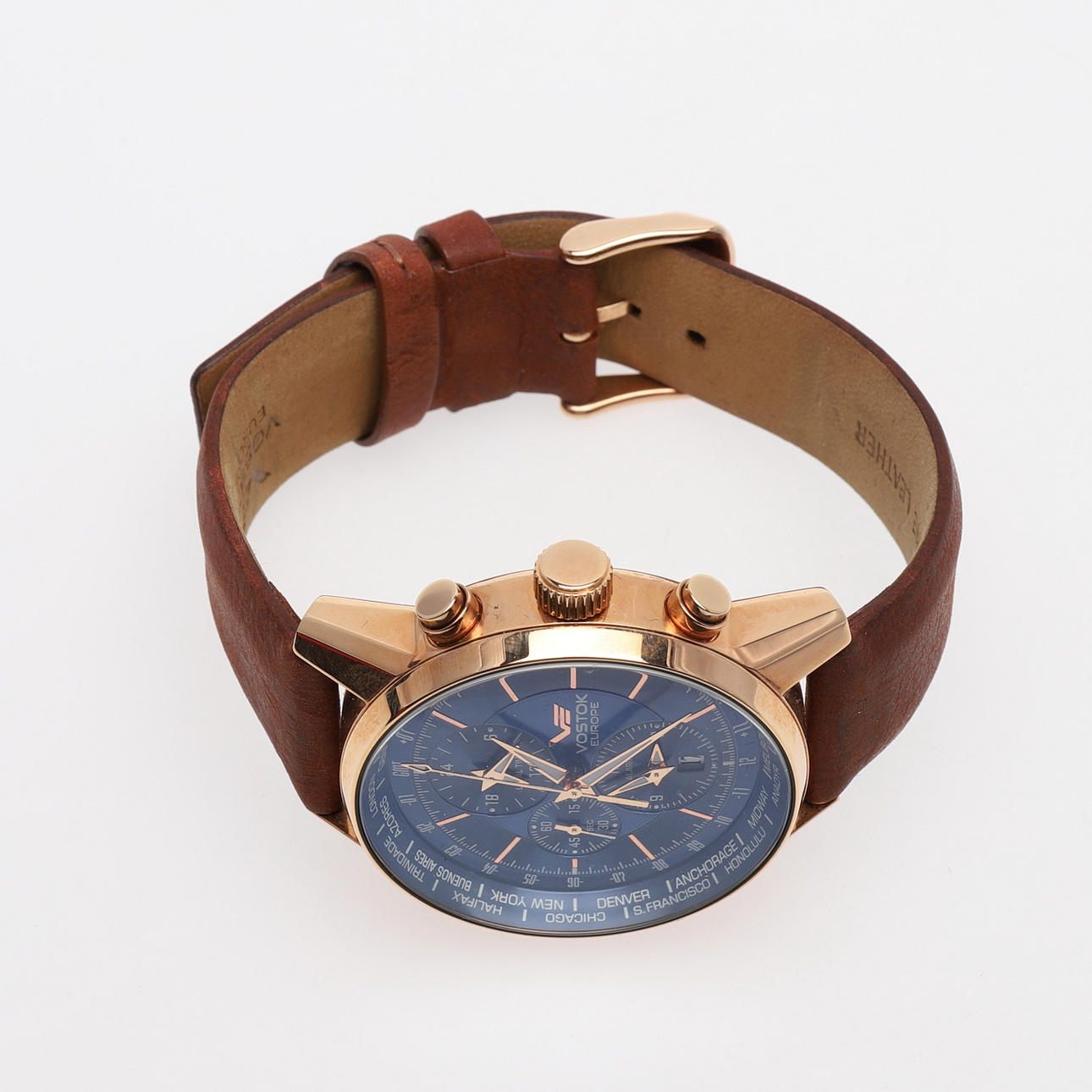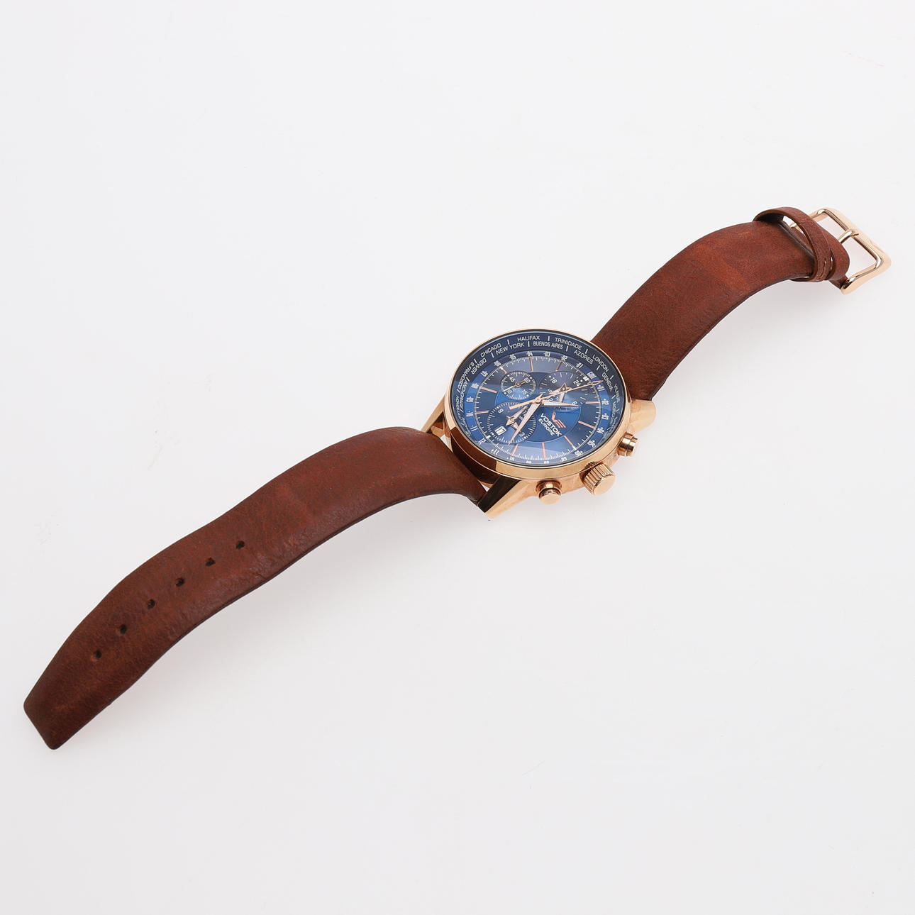Stål, med quartzverk, datum, separat sekund, världsfunktion, 24-timmarsvisning, armband av läder, diameter 43 mm.Etui, garanti 2019.