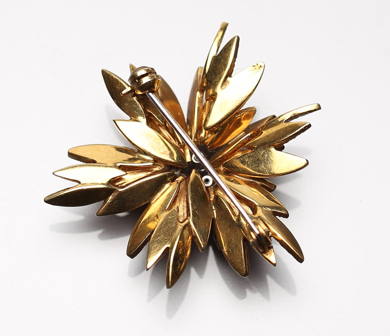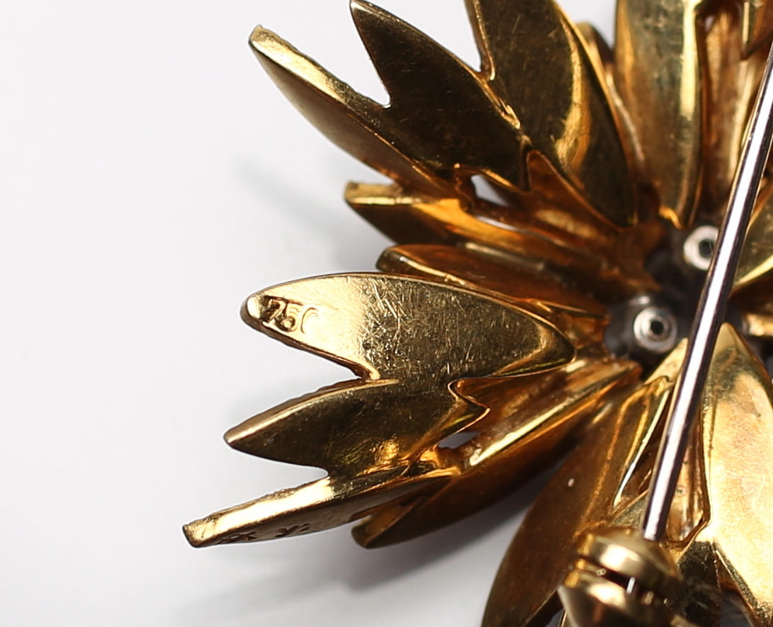 750/000 GG, brutto 11,2 g. I blomform, set med tre diamanter, tillsammans ca. 0,12 ct.