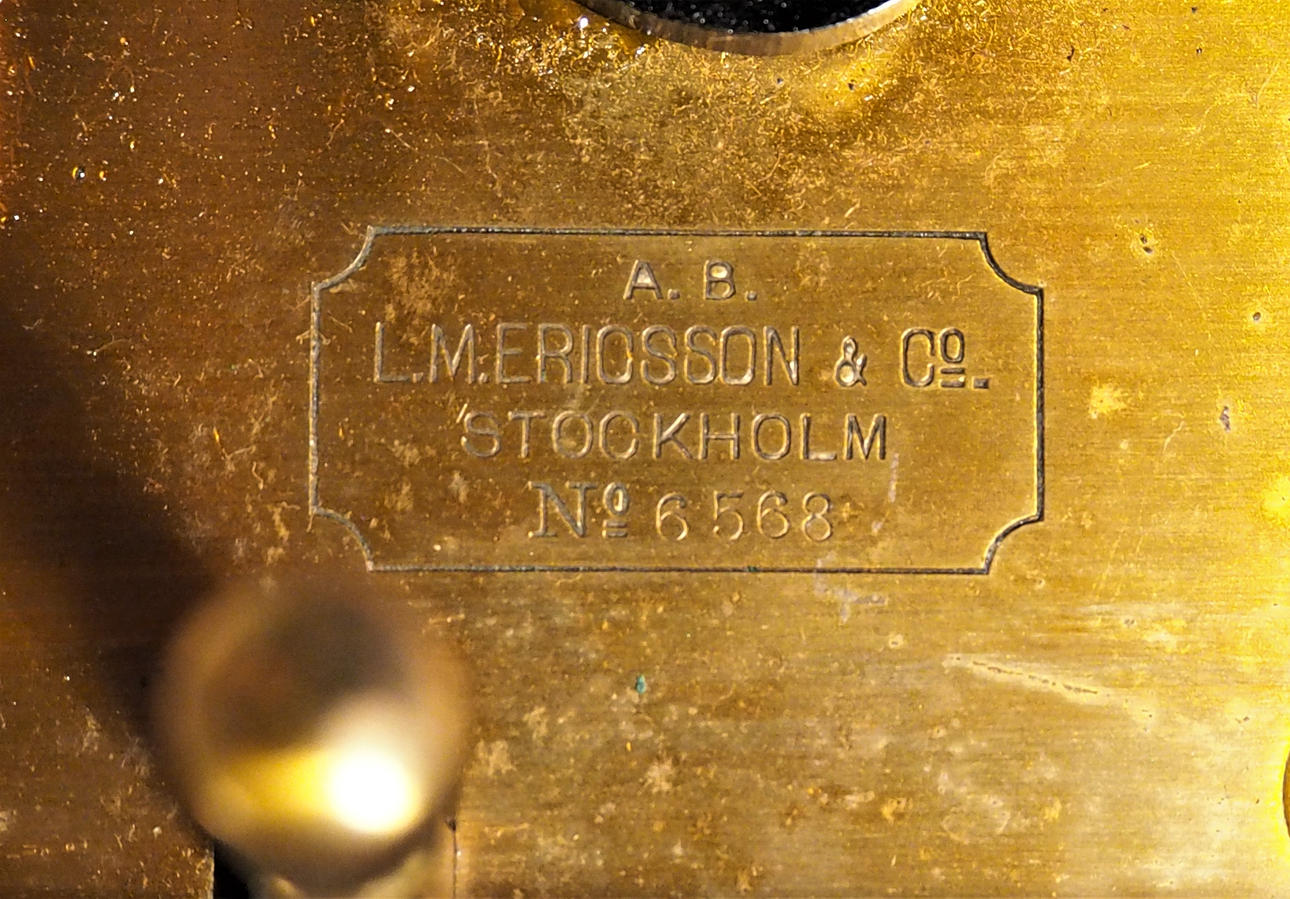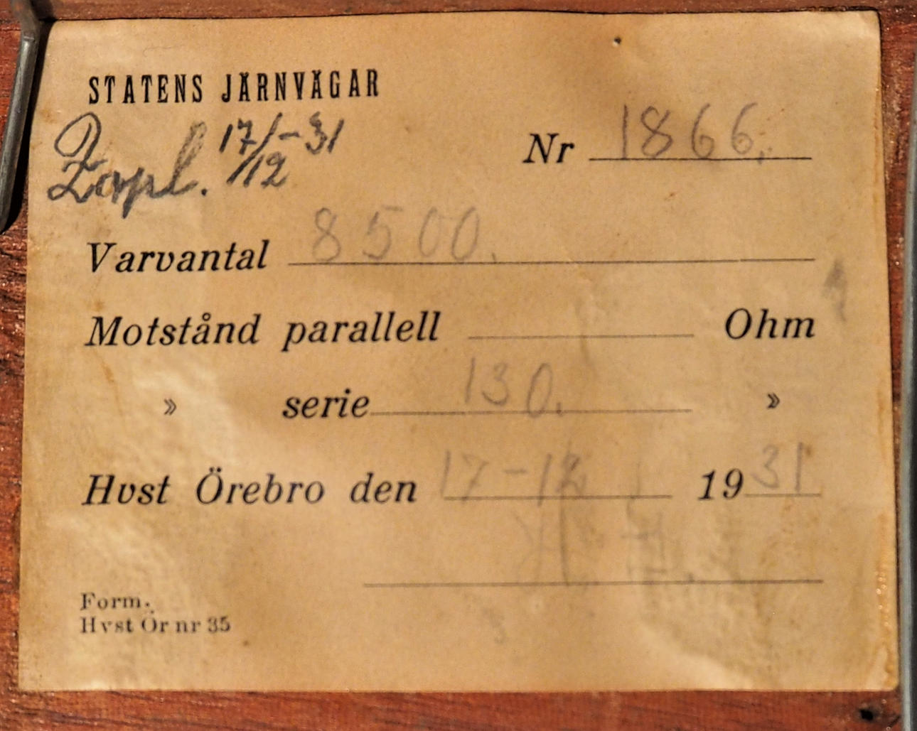 Mässing på träsockel. Märkt No 6568, även med etikett Statens Järnvägar 1931.