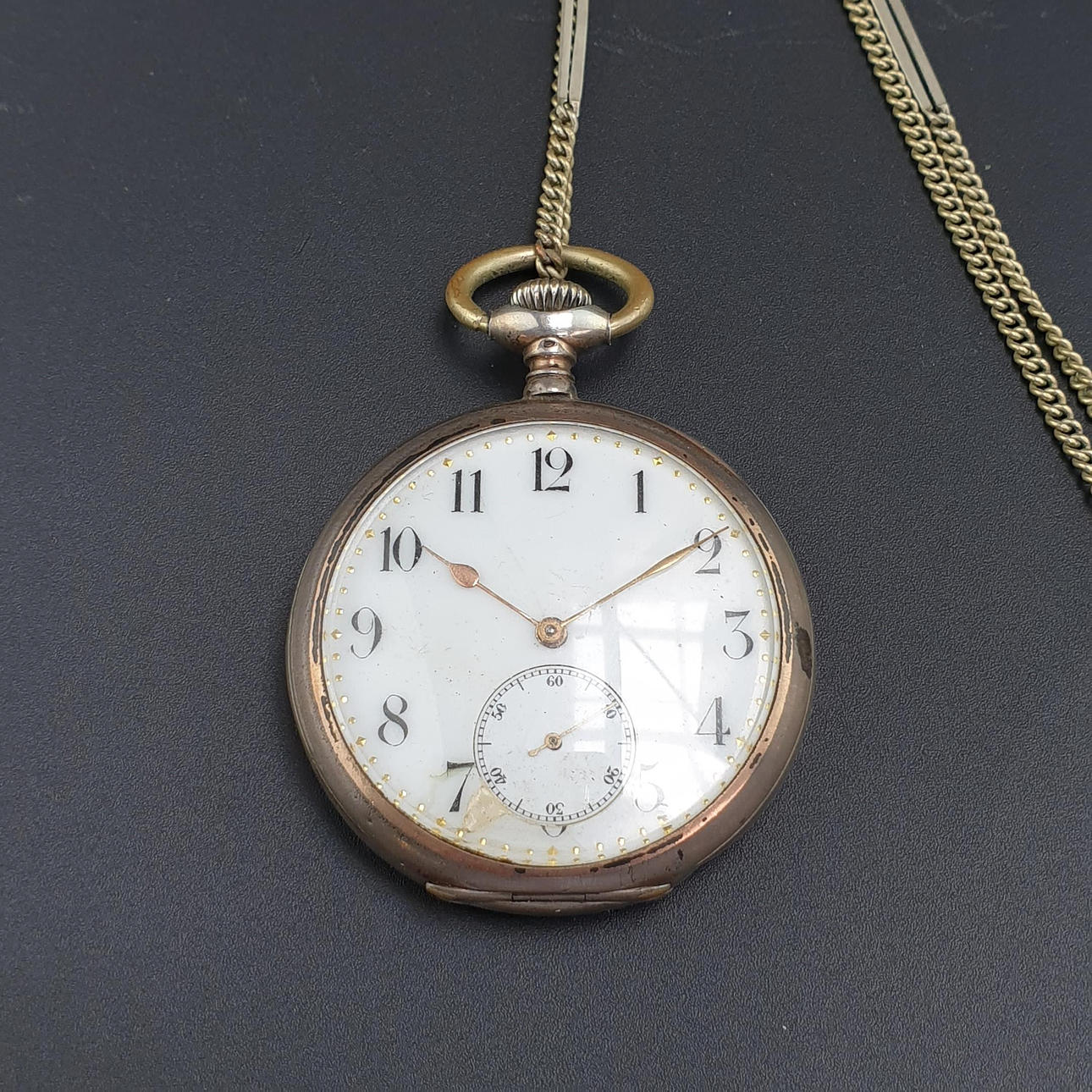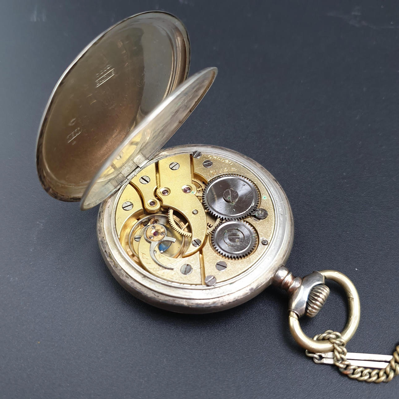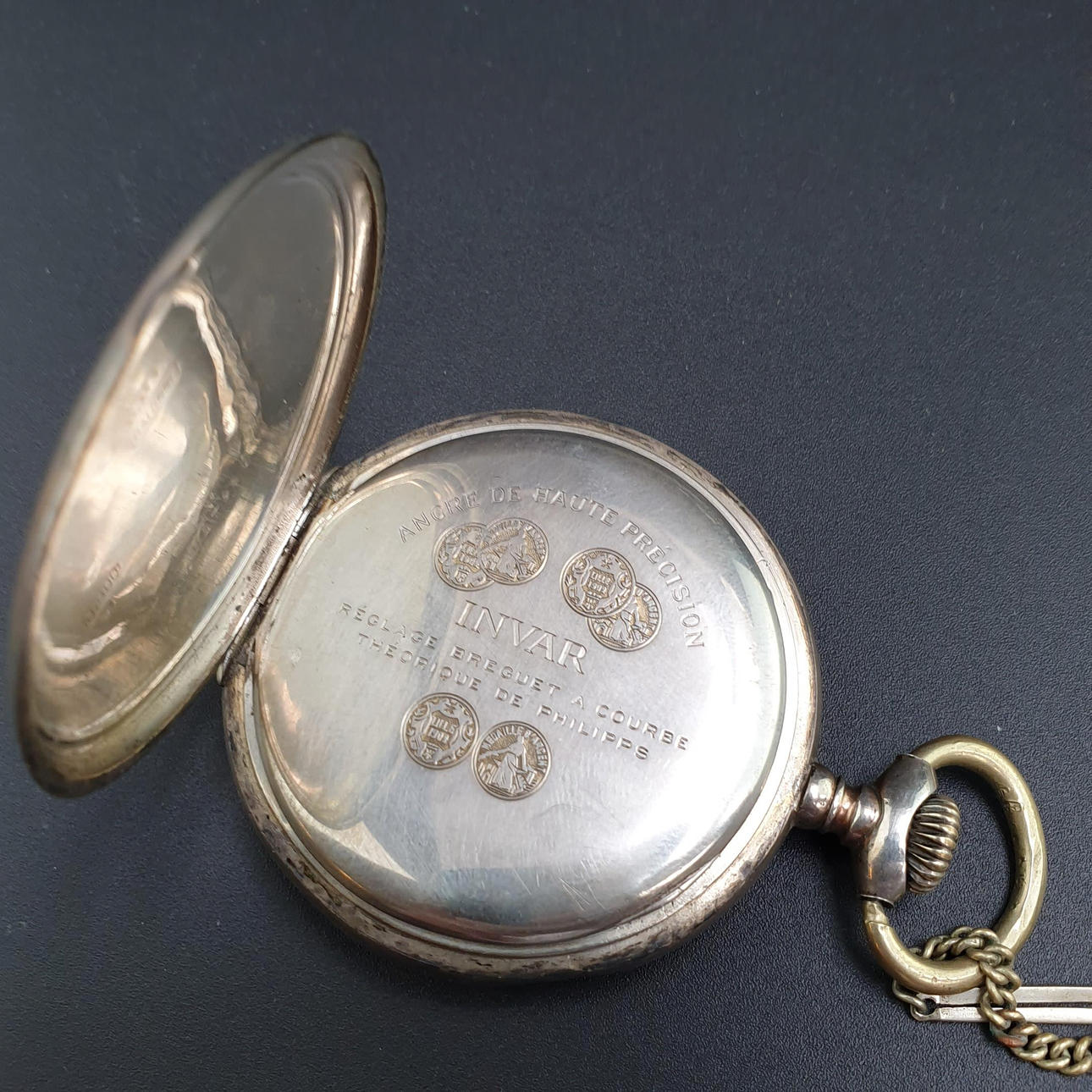 Mästarmärke ”C.M.I.”, stämplat på insidan av omslaget ”Galonné. 0.800 halvmåne/krona”, nr 017986, graverat innerlock: ”Ancre de haute précision”, ”Réglage breguet a courbe” (Breguet spiral) ”Théorique de Philipps”. ”Medal D'Argent” och ”Lille 1902", urverk märkt ”Invar”, arbetsnummer 025540, guillocherad och garnerad på baksidan, vit emalj urtavla med arabiska siffror, små sekunder klockan 6, vikt ca 87g, diameter ca 50mm, med Alpacca silverkedja.