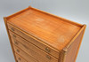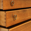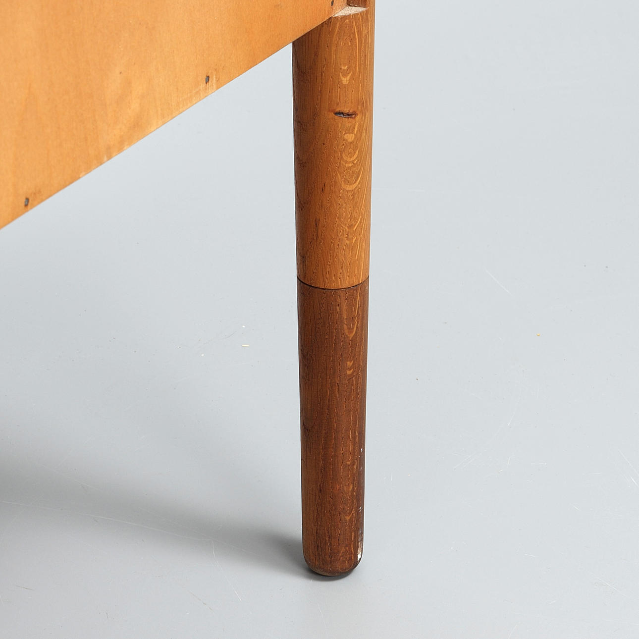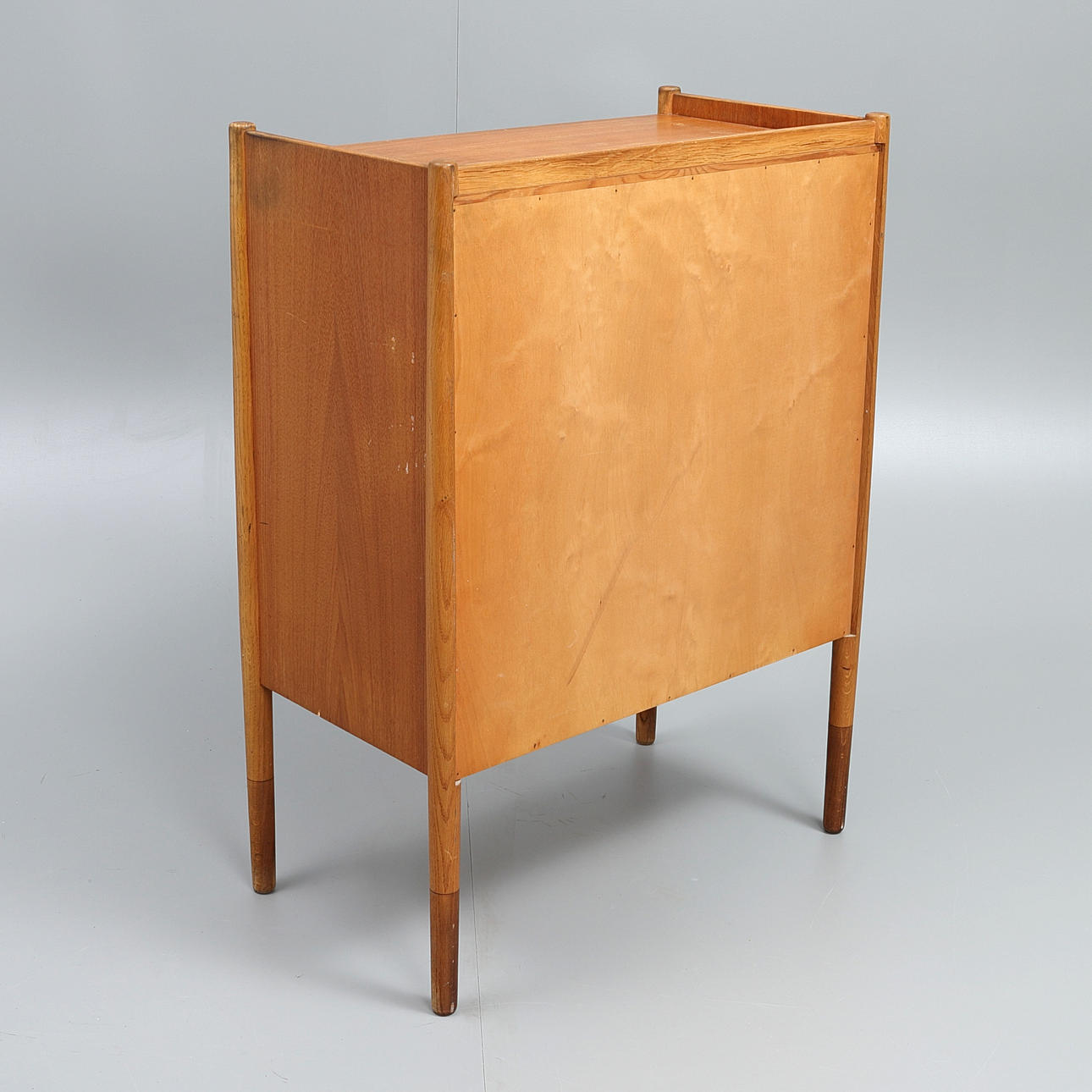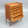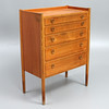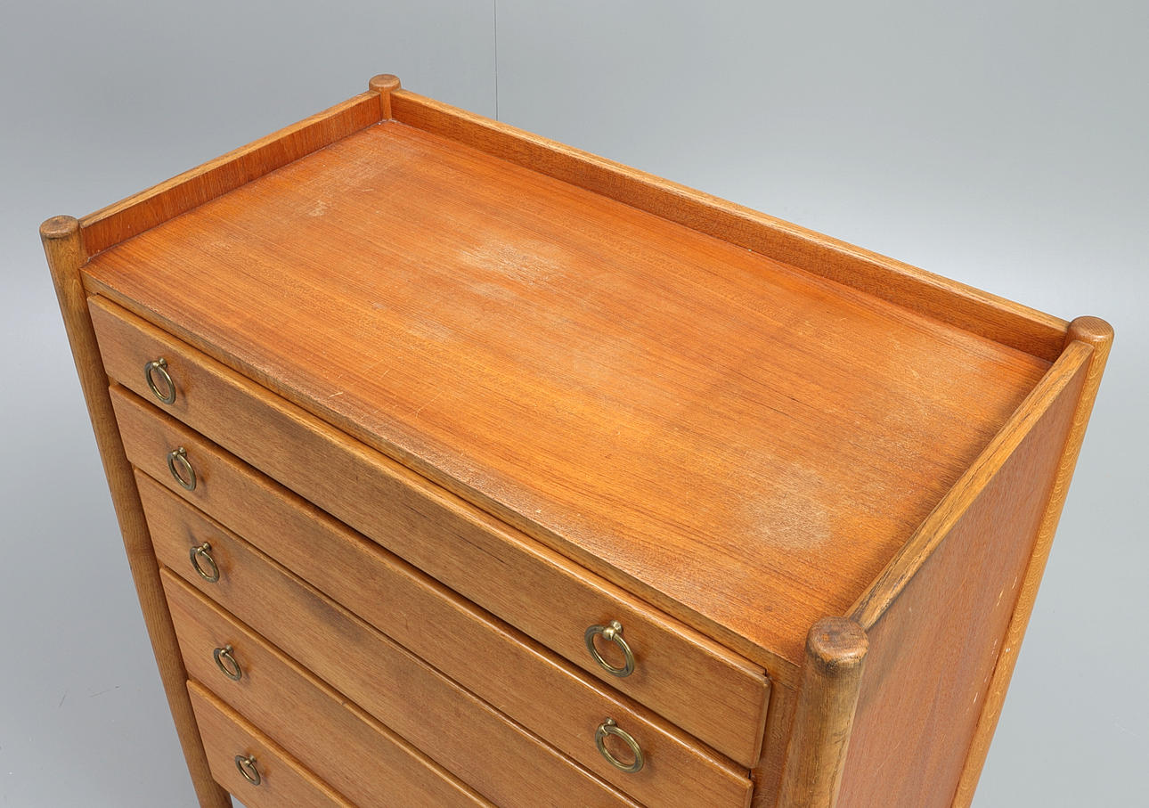 Fanerad mestadels med teak. Dragbeslag av mässing. Dessa märkta AB Br. Miller, 902, Rundade ben med mörkbonade avslut, höjd ca 101, 73x40 cm.