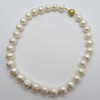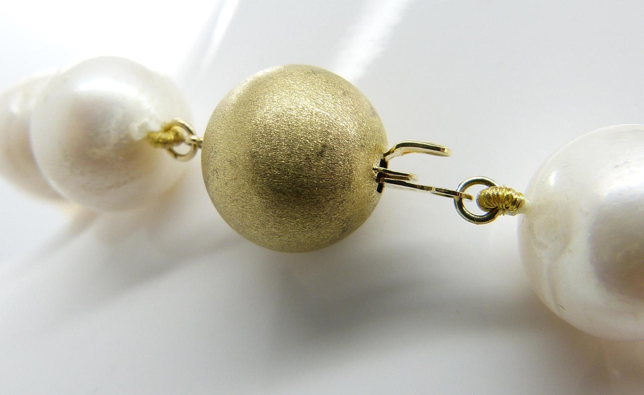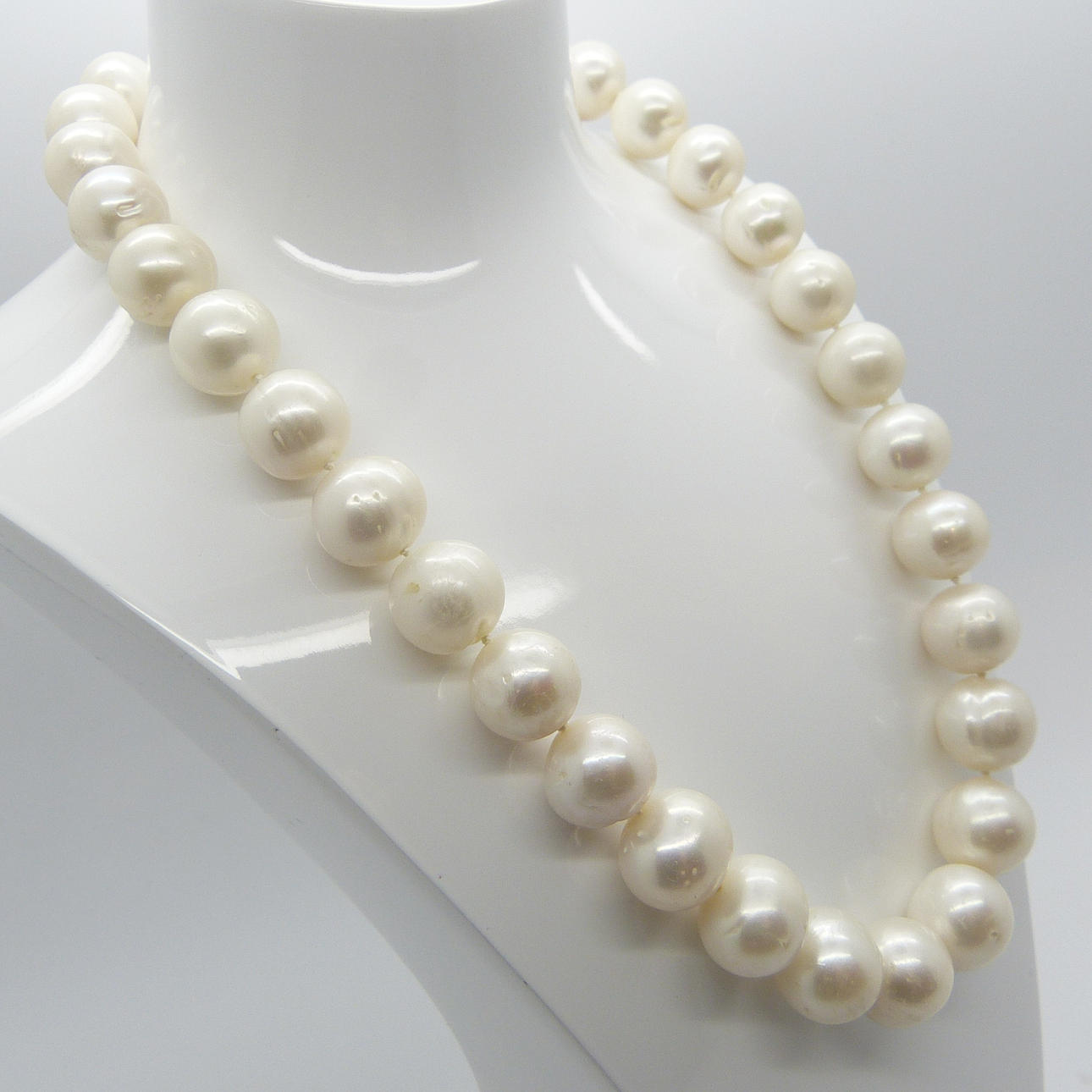 De vita odlade pärlorna i detta halsband varierar mellan 12-14 mm i diameter, ca.