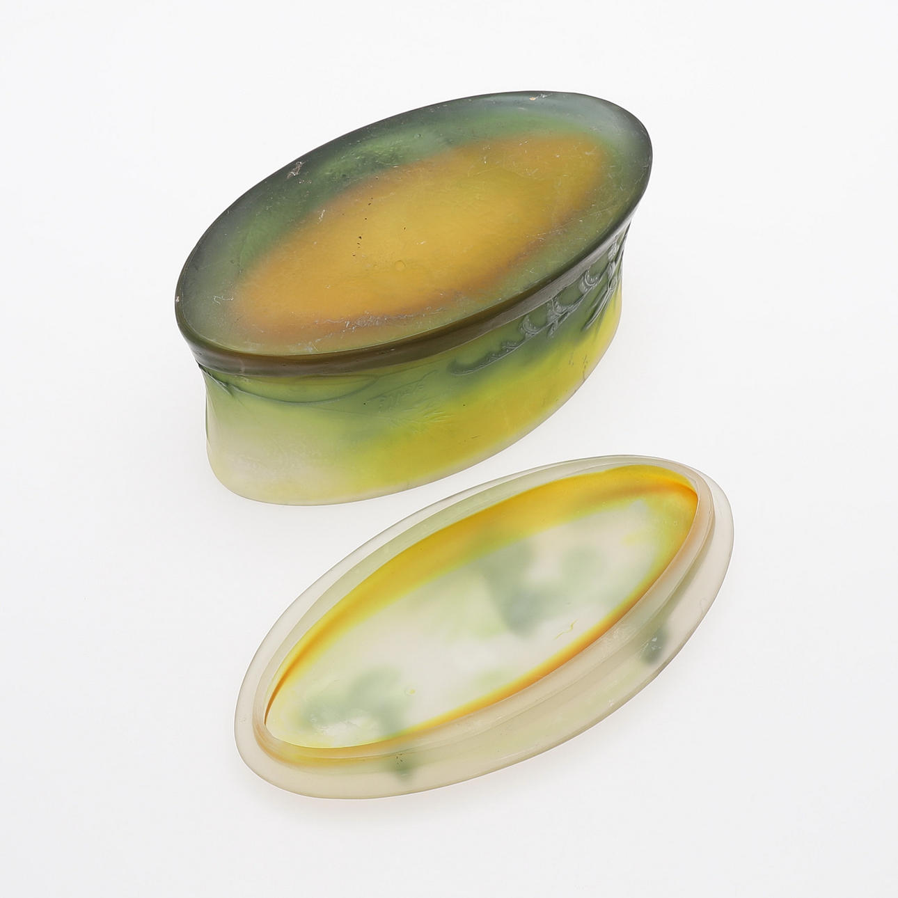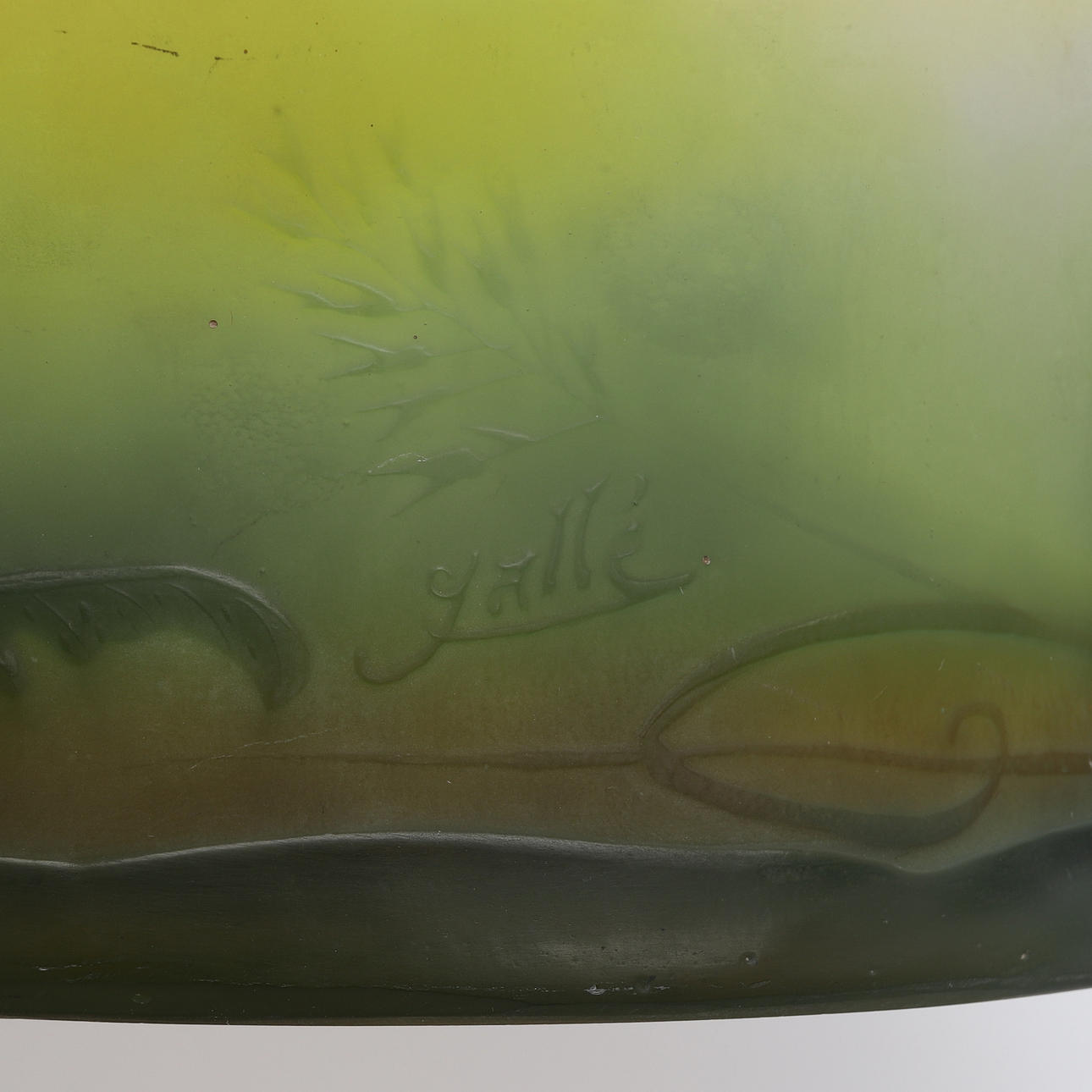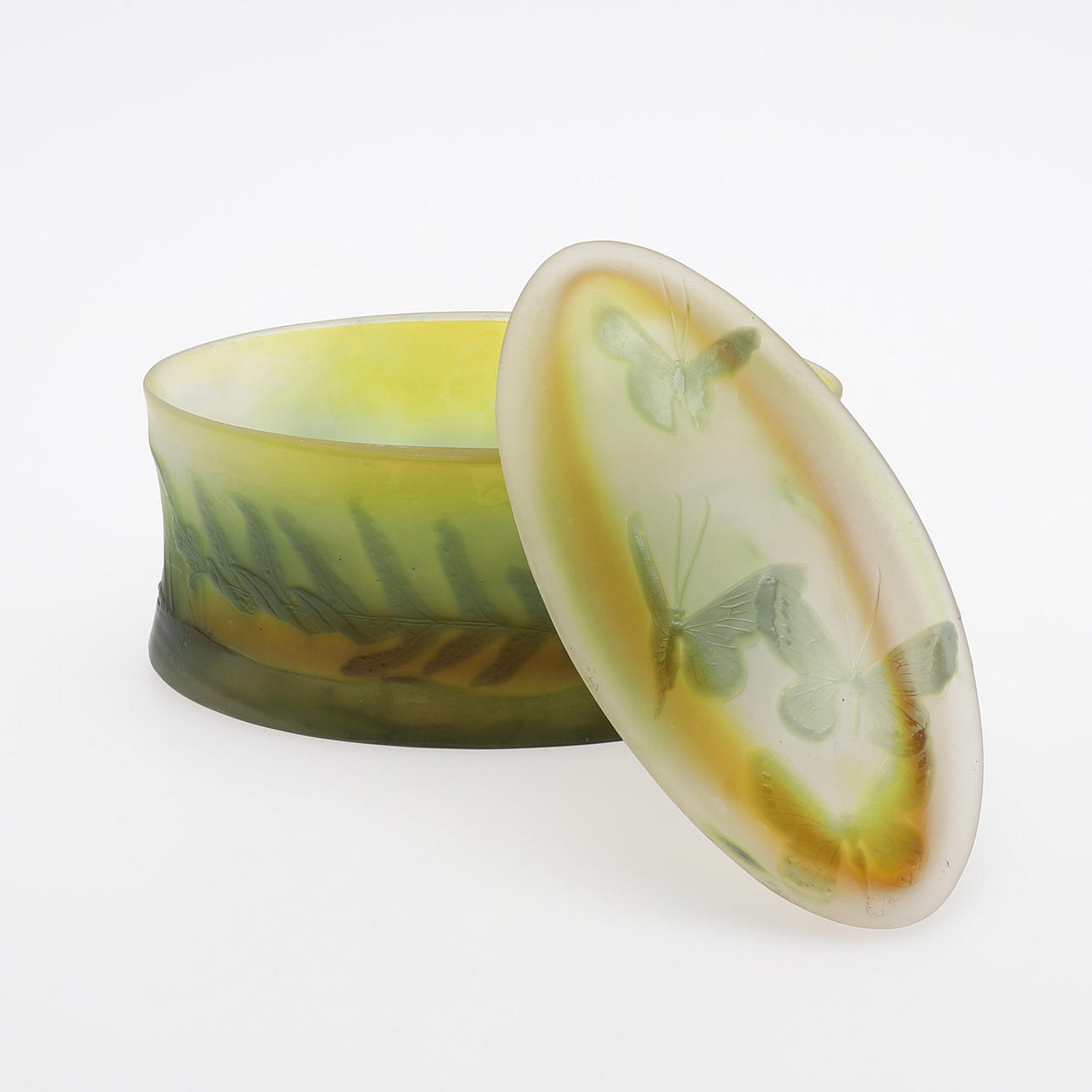Art Nouveau, överfångsglas i tre färger med etsad dekor av fjärilar och växtlighet, signerad "Gallé", längd 18 cm.