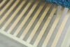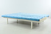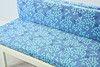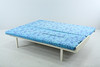 Trästomme, träribbsbotten, klädda dynor ett par, en dubbelvikt till ryggstöd. Tryckt bomullstyg avtagbart med dragkedja. Längd 195 cm Bredd 83 cm.
