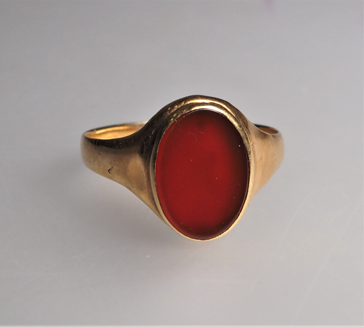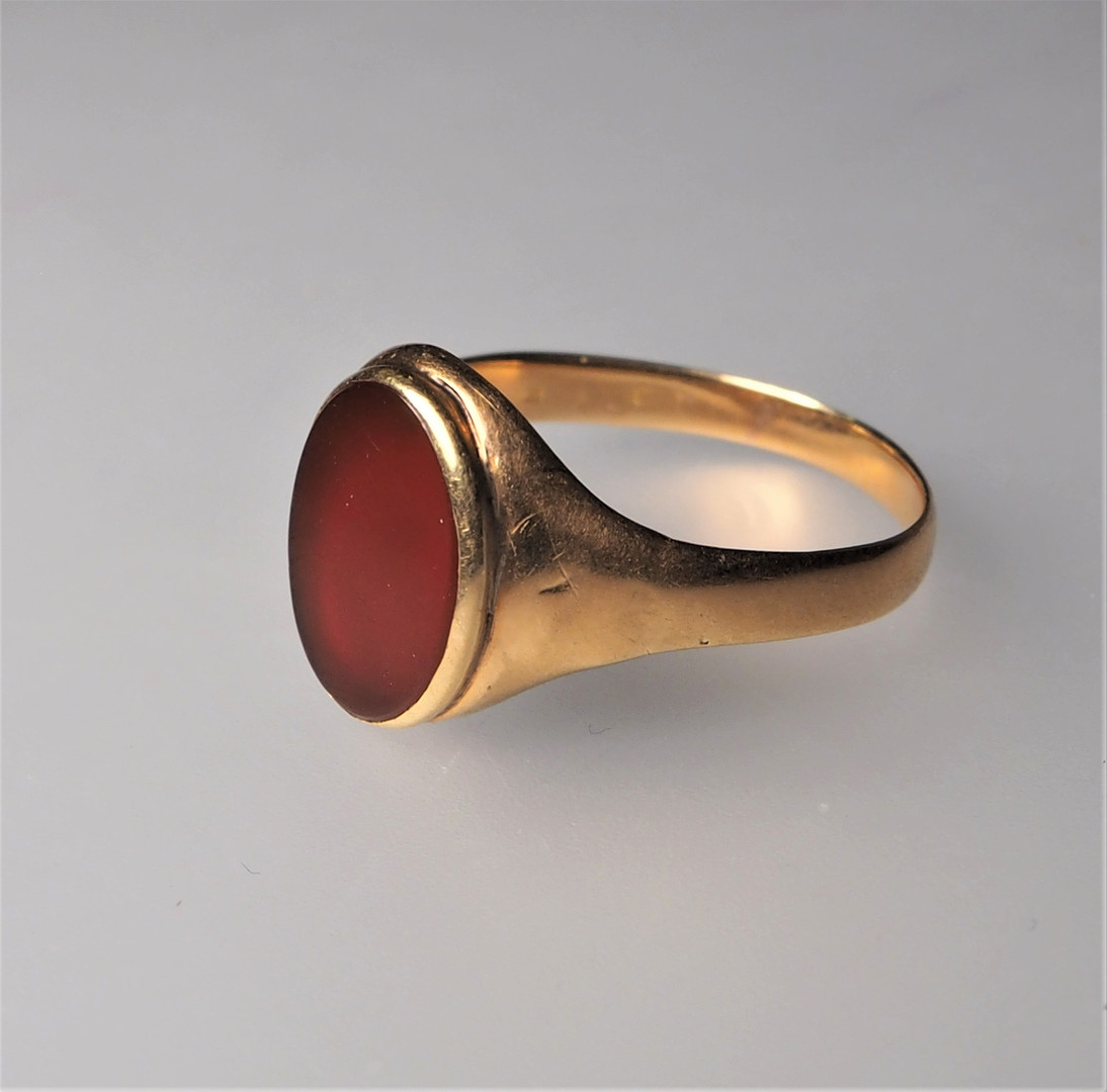 1470088. RING MED RÖDBRUN STEN, 18 K.