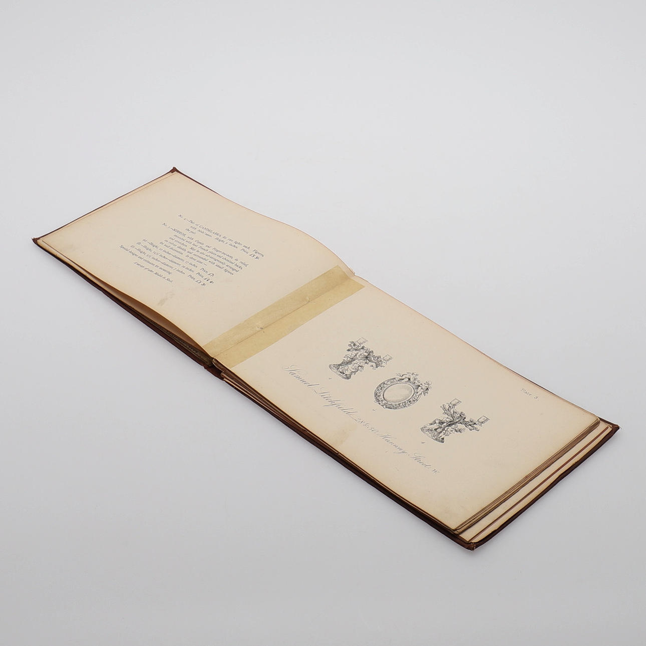 Med 21 planscher och utvikbar del med 51 porslinsmärken, med inklistrat tryckt brev från antikhandlaren Samuel Litchtfield daterat Julen 1884, 21,5x14,5 cm.