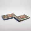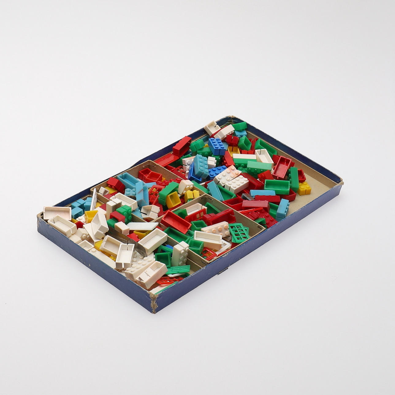 Ej fullständigt genomgånget, enstaka senare klossar förekommer (tillverkade fr o m 1953), bruksslitage, ställvist färgfällningar, kartongerna med slitage och revor.