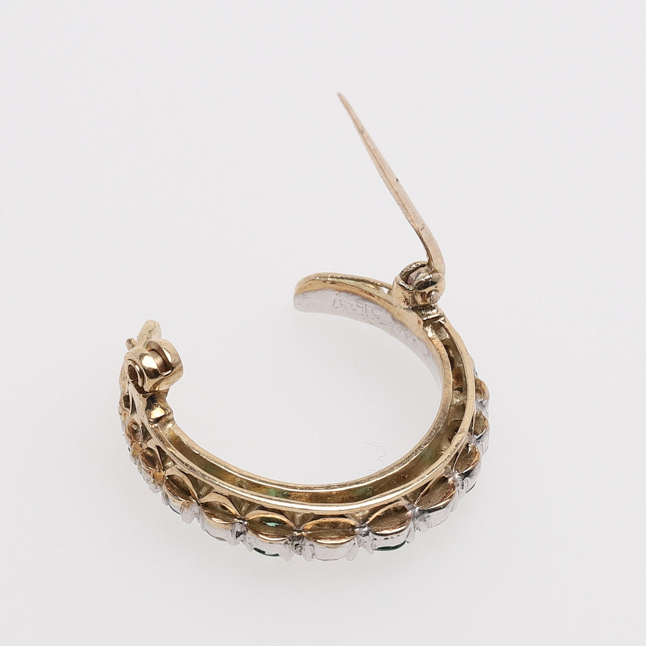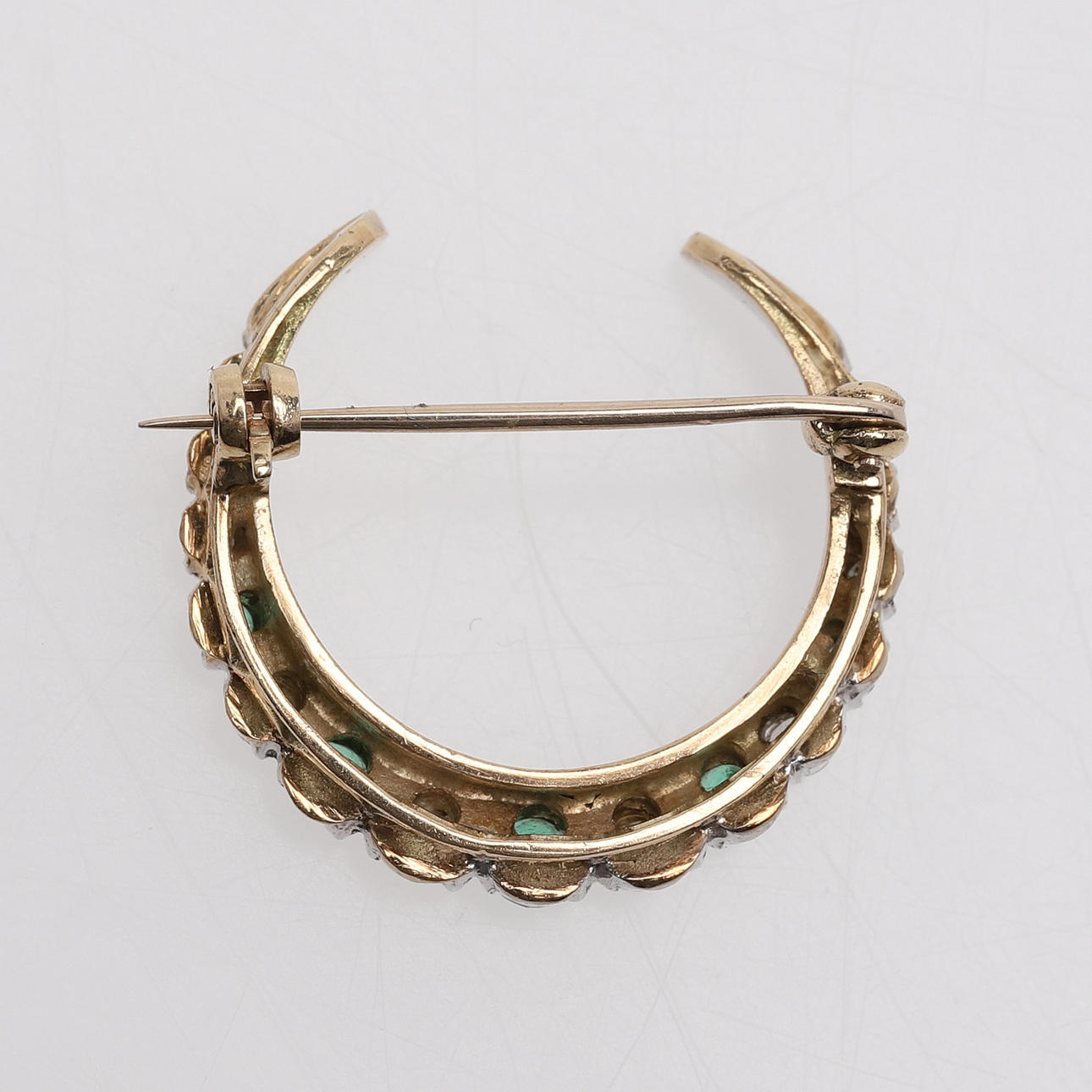 9k guld med nio snaragder och sju diamanter, diameter 2,9 cm, vikt 6,7 gram.