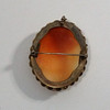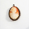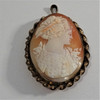 Omsorgsfullt snidad komo, ca 6 x 5 x 1 cm. Motiv: dam med updo med fjäril i håret, honungsfärgat skal, snidat, med mässingsram.