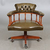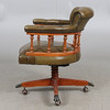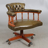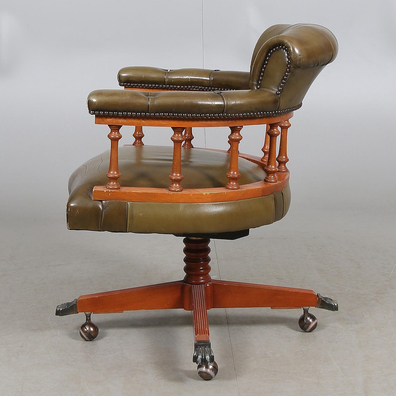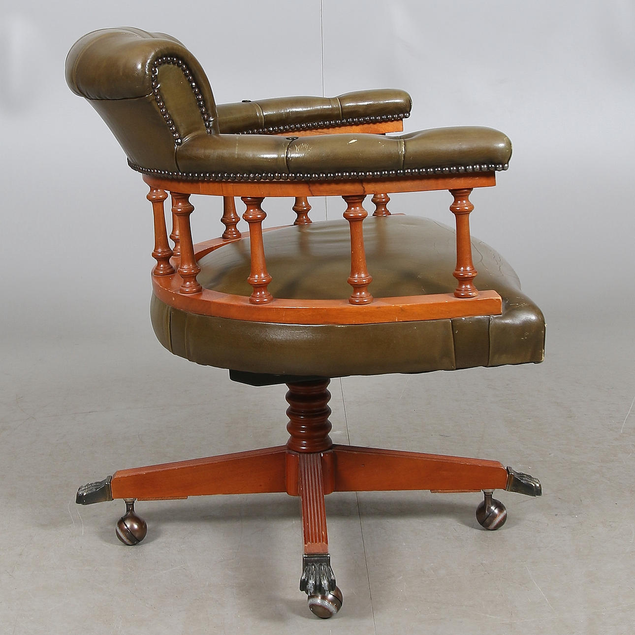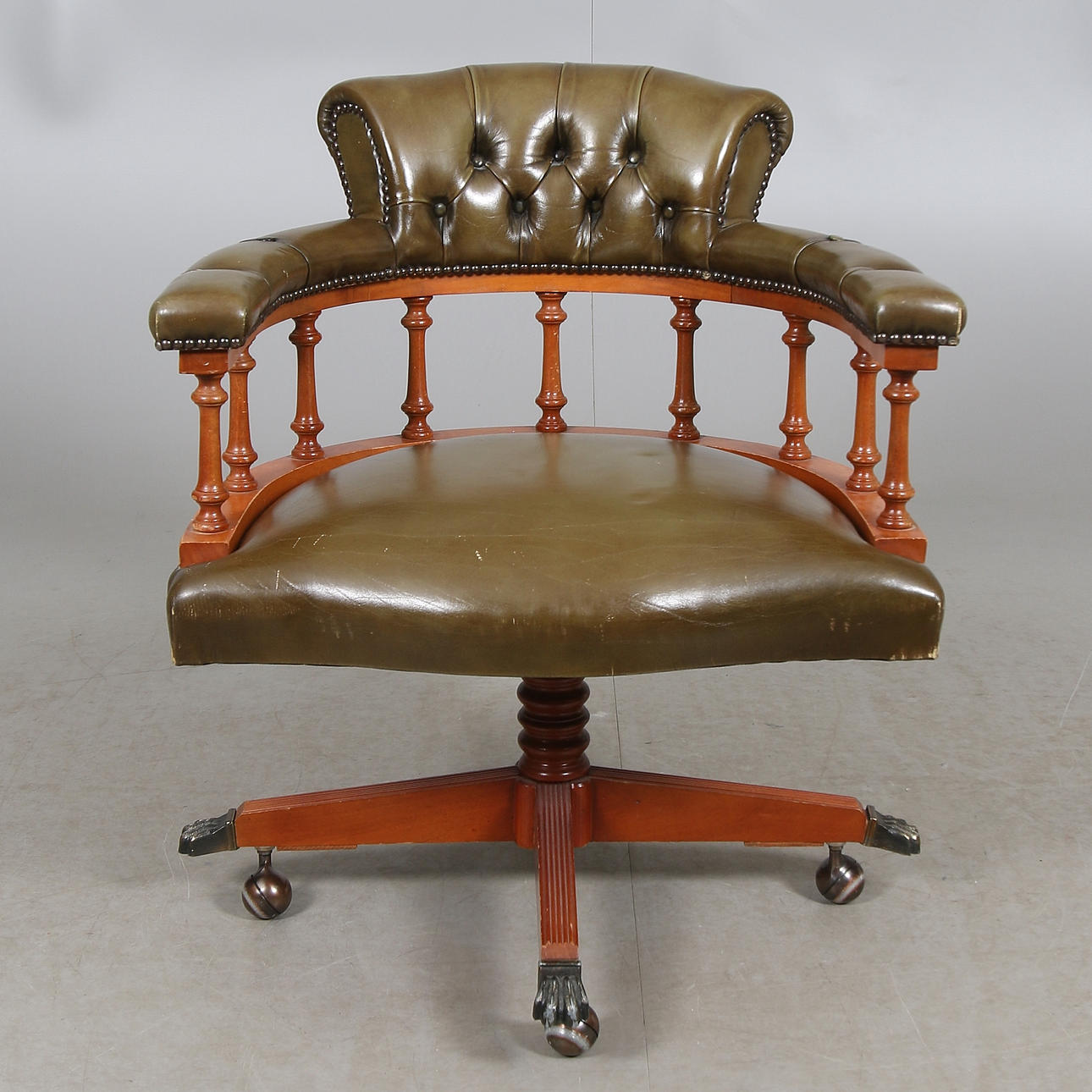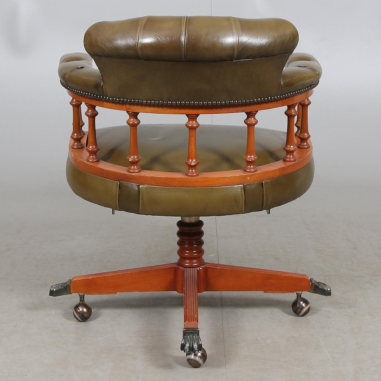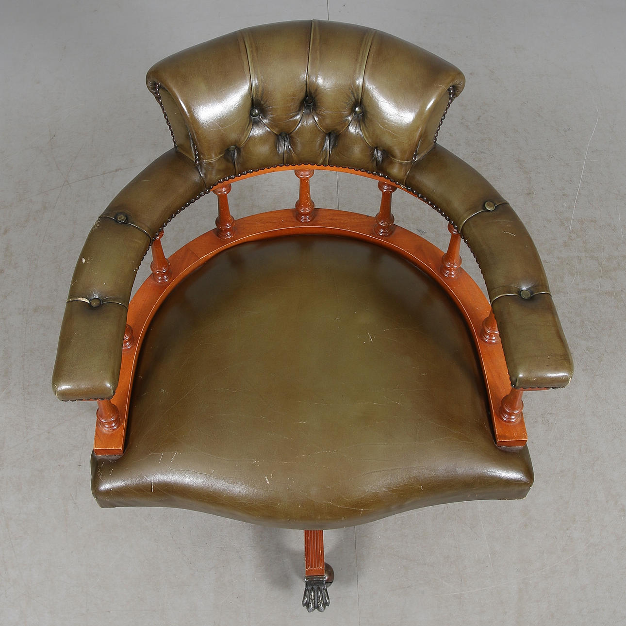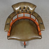 Läderklädsel i grönt, djuphäftad rygg samt nitar längst med armstöden, står på rullbara kulfötter, dekorerad med tassar. Undersida märkt "Ring Mekanikk Norway".