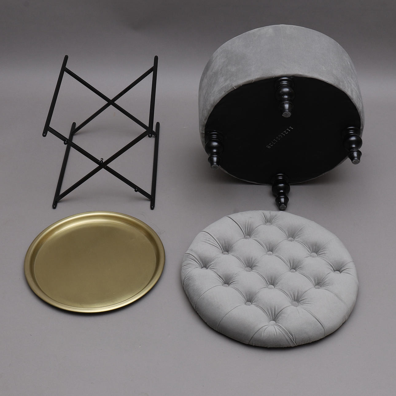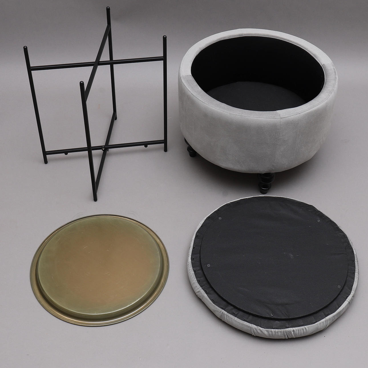 Sittpuff med lock, förvaring, grå sammetsliknande tyg. "Alexandra", Mio möbler. Höjd ca 40 cm, diameter ca 50 cm