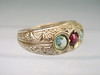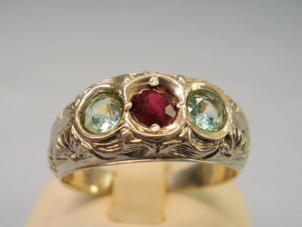 Den är utformad som en bandring och dekorerad med en central, rund fasetterad naturlig rubin. Detta flankeras på båda sidor av en rund fasetterad blå topas i mycket vacker glans.