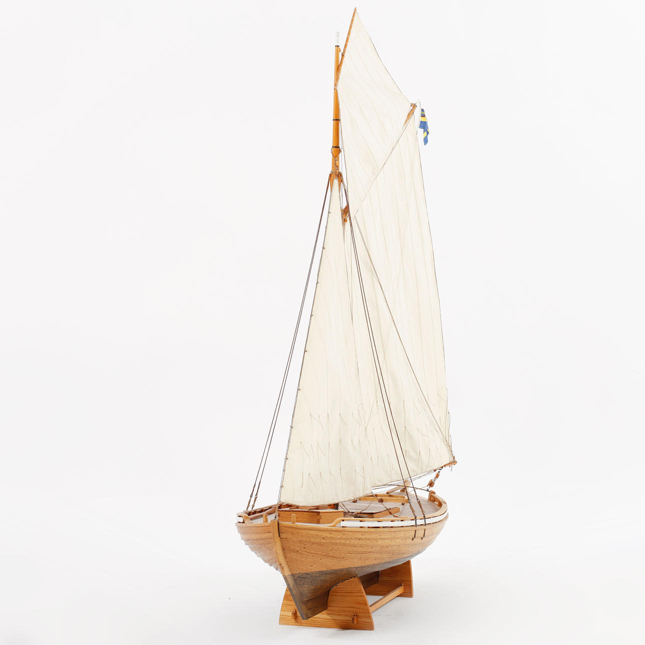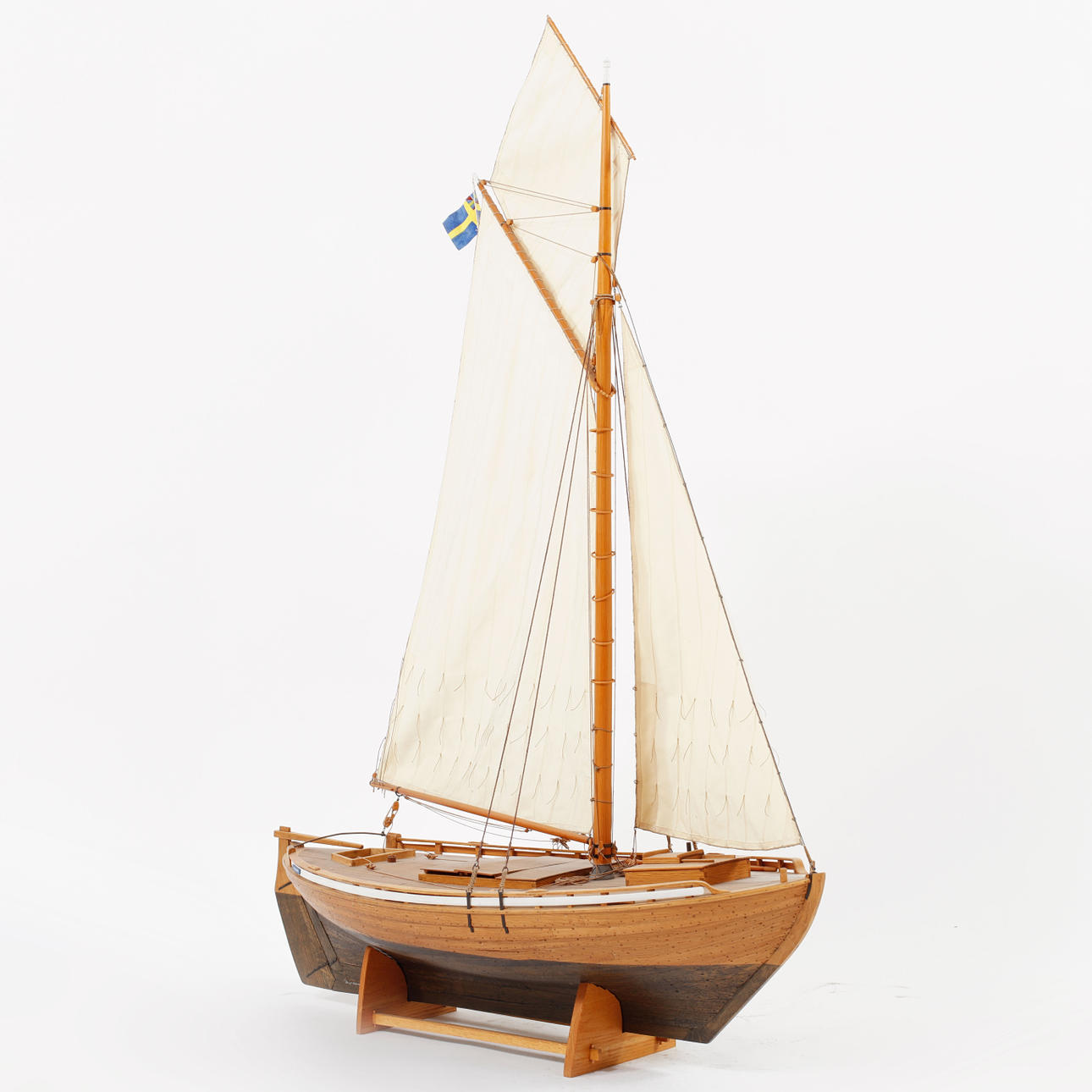 Däckbåten Frifararen, skala 1:15, längd ca 79 cm, höjd med sockel ca 110 cm.