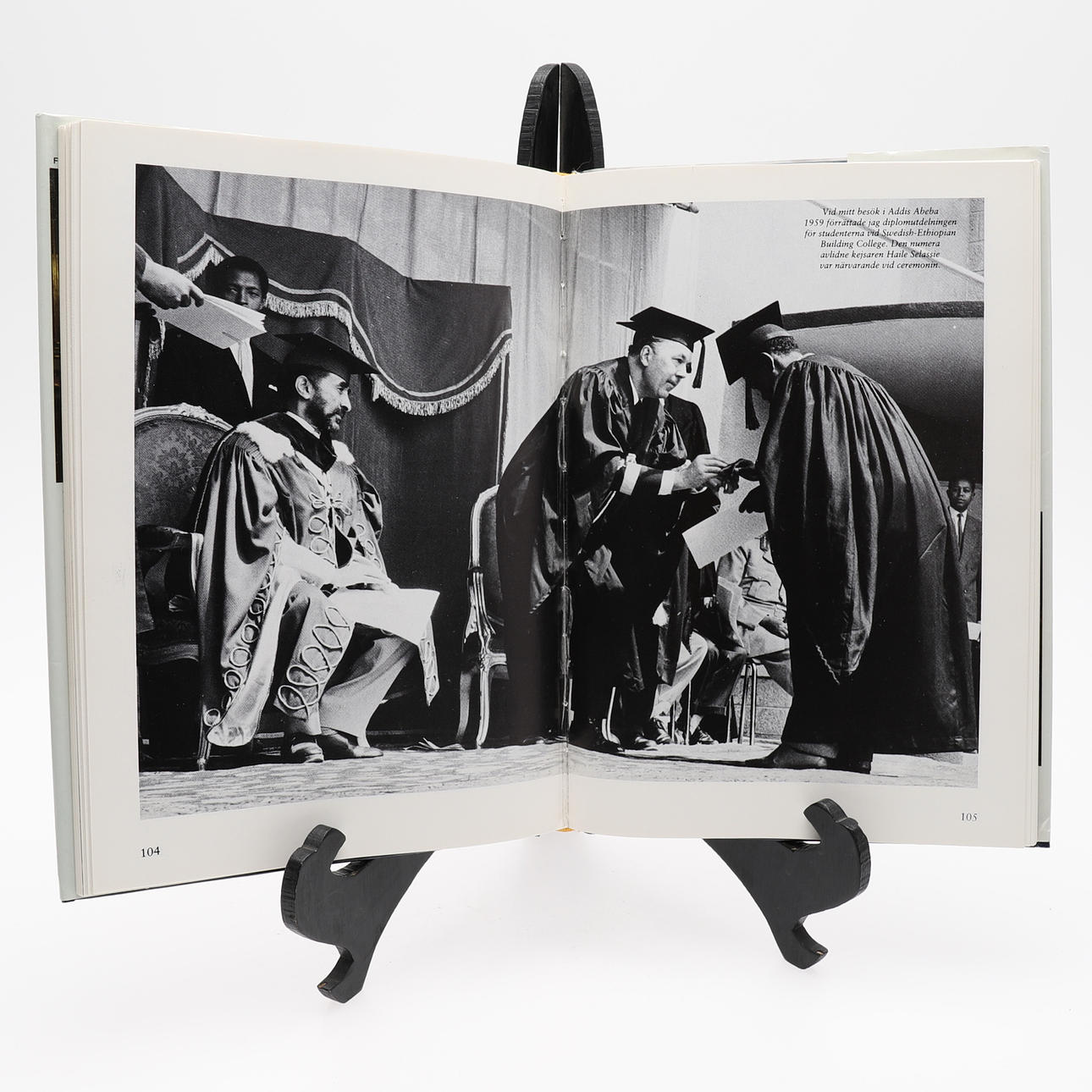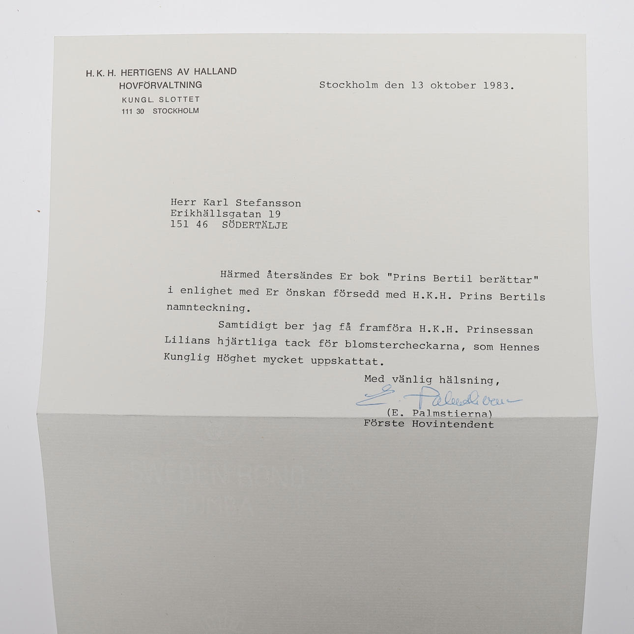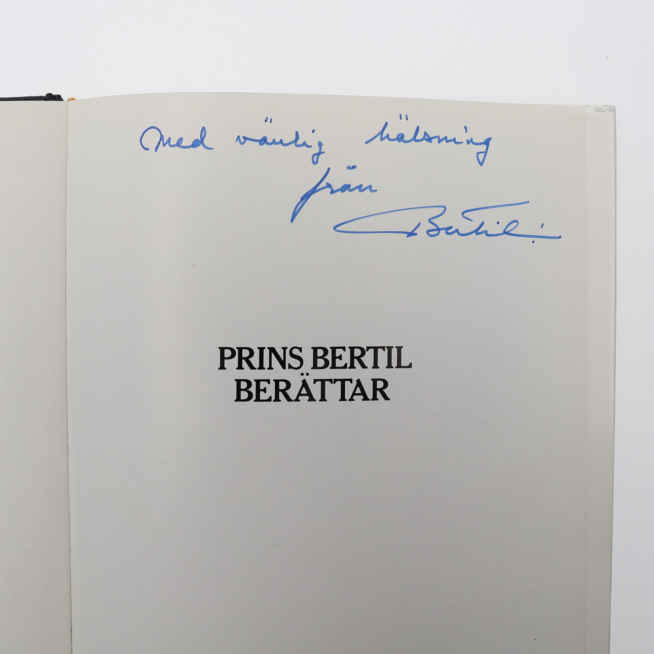 Prins Bertil, hertig av Halland m. m. , (1912-1997). Boken Prins Bertil berättar av Bo Bengtsson, Lars Ekengren och Uno Grönkvist. Svensk Dagbladets förlags AB, 1983. 4:o i ett blått konstskinnband med förgylld text och i ett fotoillustrerat skyddsomslag. Upptillpå halvtitelbladet en dedikation med blå tusch: "Med vänlig hälsning från Bertil" Medföljer ett brev från hovförvaltningen som vidimerar namnteckningen. Rikt fotoillustrerad i svart och vitt. 182 sid. , (II).