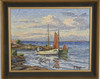 Kustbild med fiskebåtar, signerad A Wollmer 37x47 cm.