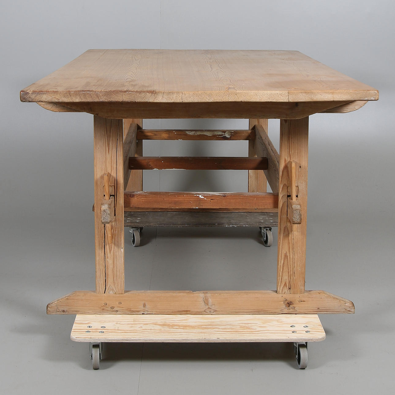 Tillverkat av furu. Dubbla tvärslåar. Längd ca. 170, bredd 101, höjd 78 cm.
