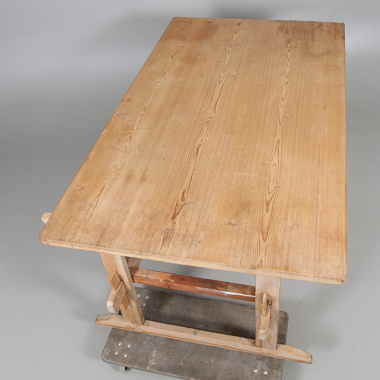 Slitage. Skador. Senare förstärkningar och kilar. Ej ursprunglig bordsskiva.