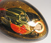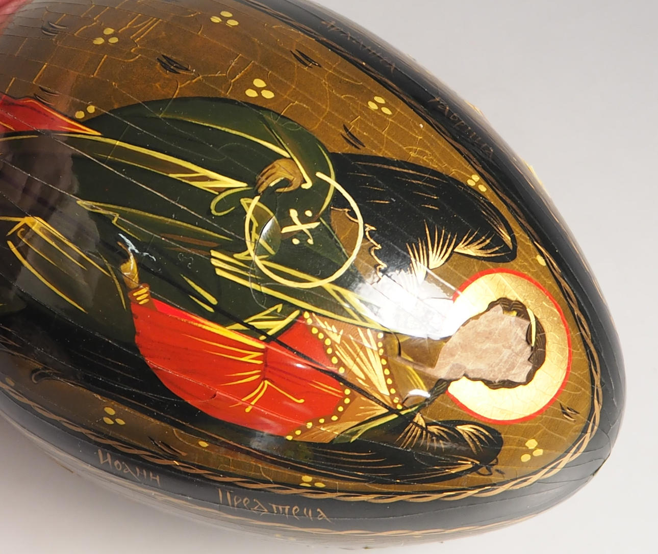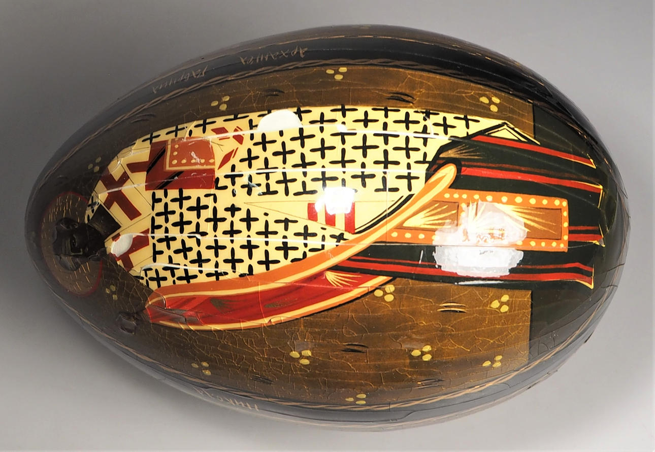 Största målade ägget: färgbortfall och krakeleringar. Bruksslitage.