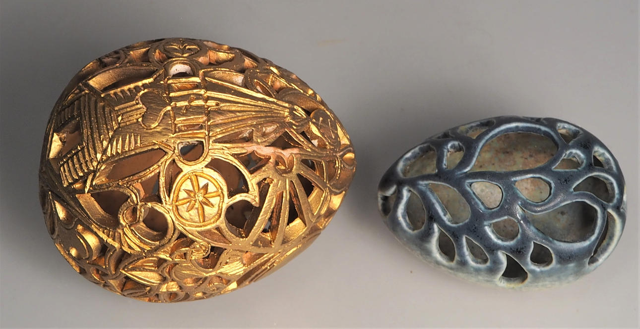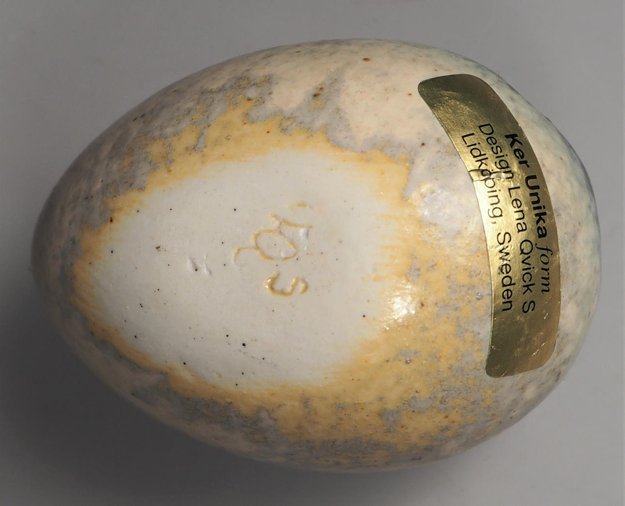 Porslinsägg, blå/beige, höjd ca 4,5 cm. Längd ca 7 cm. Design Lena Qvick S, Lidköping.