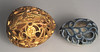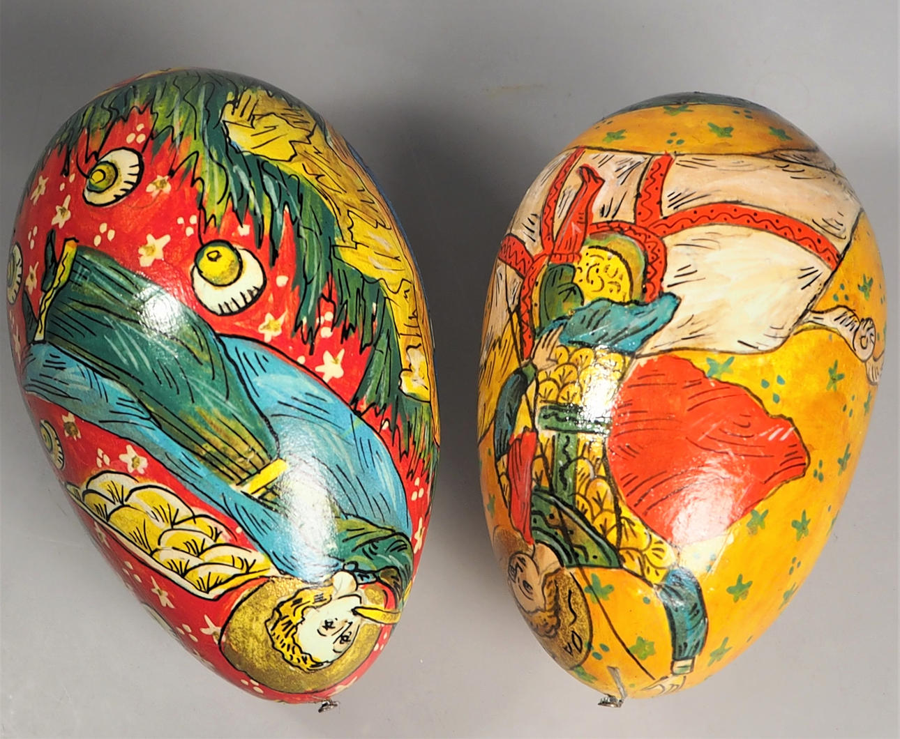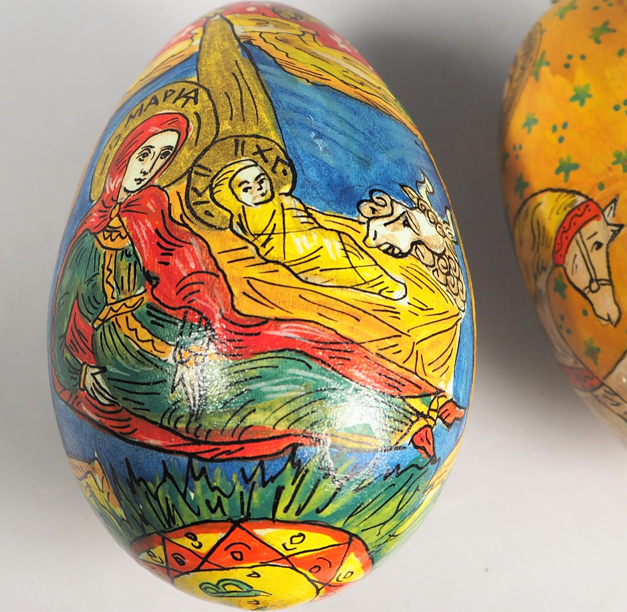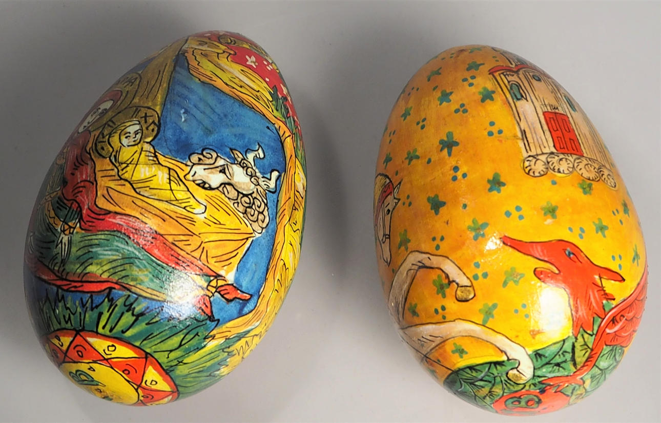 3 målade ägg. Storlek höjd ca 9 - 14 cm. Diameter ca 6 - 10 cm. Guldfärgat ägg: höjd 9 cm, diameter ca 7,5 cm.