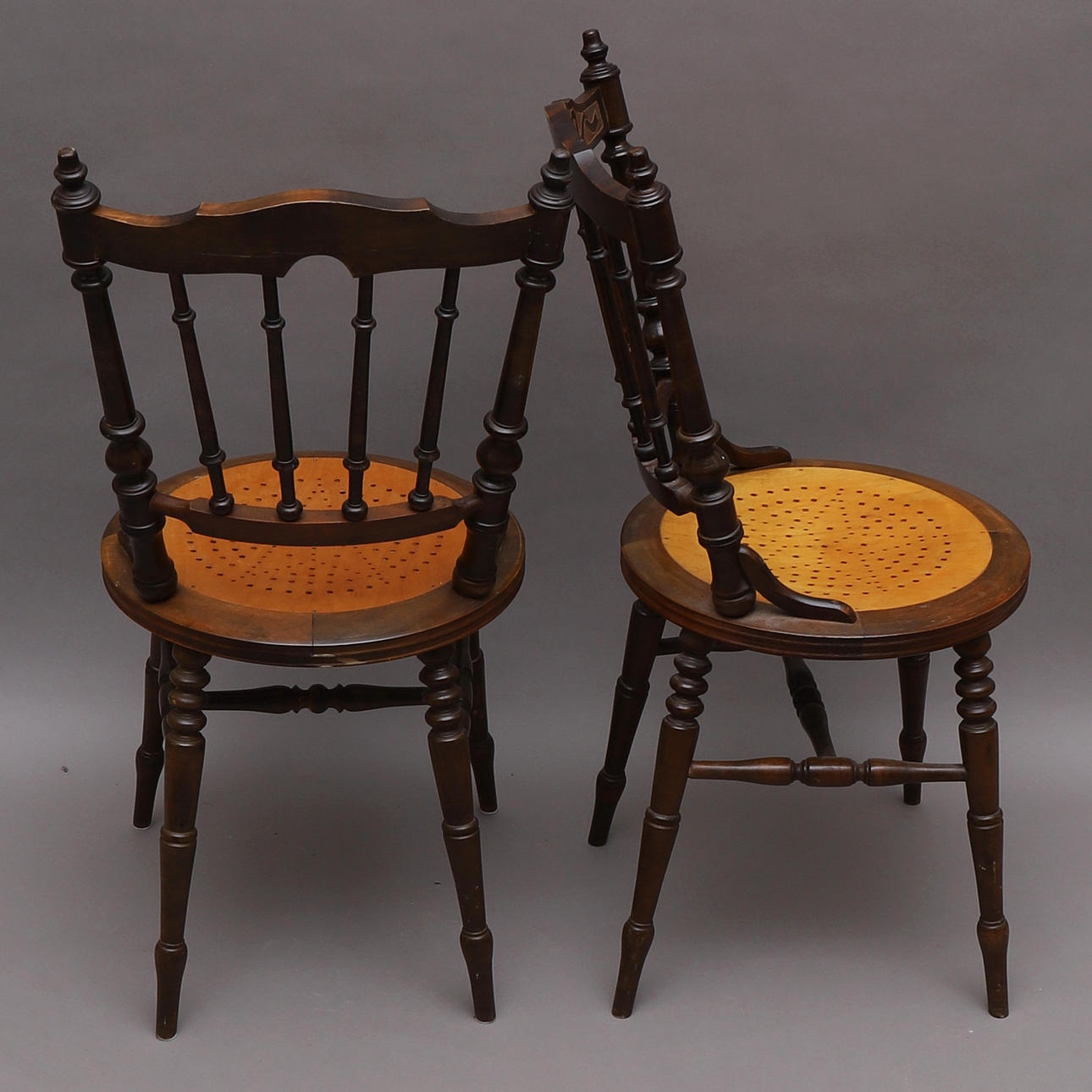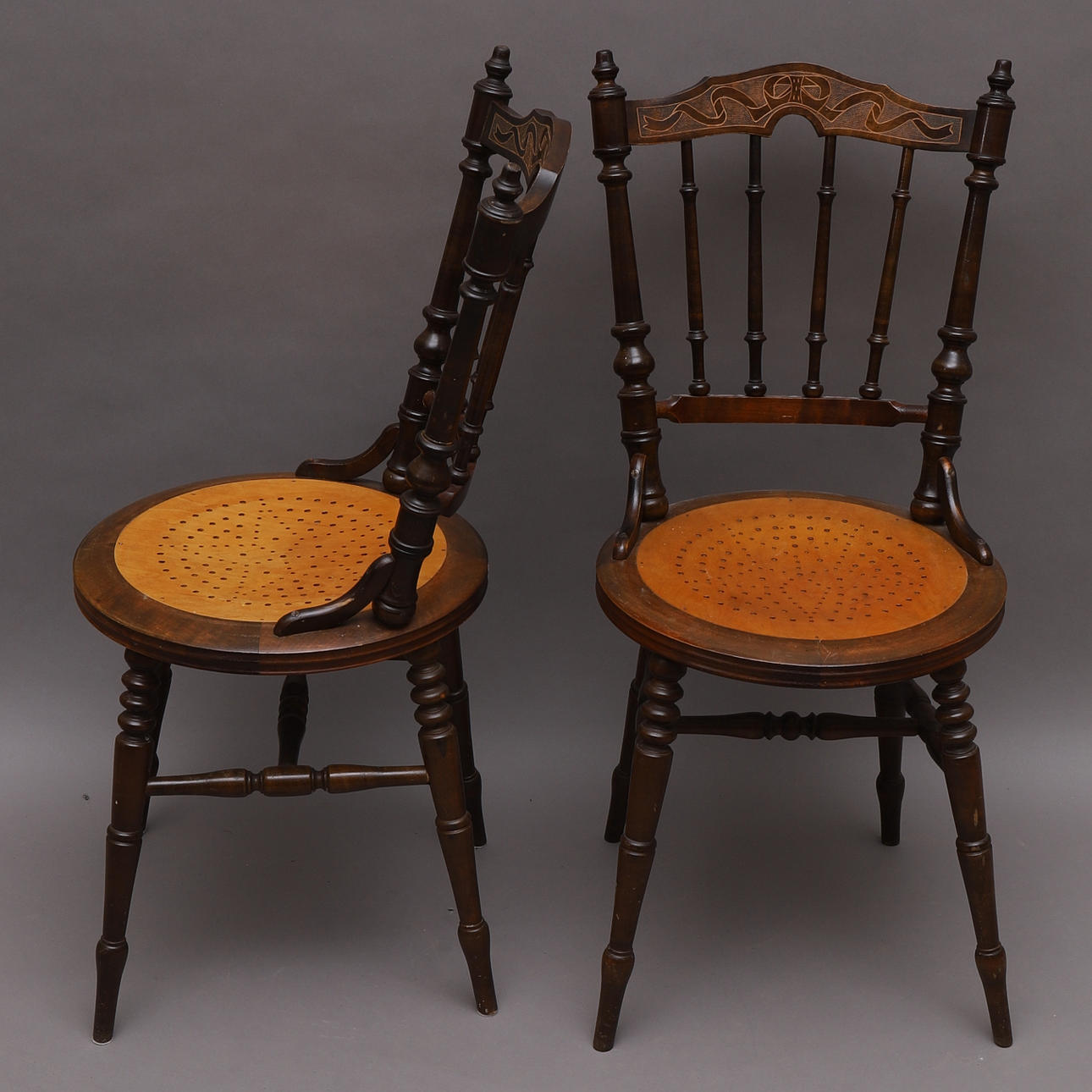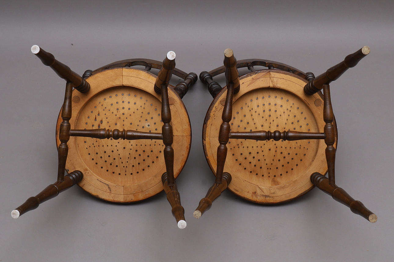 Stolar med svarvade ben och pinnar. Sits med perforerat hålmönster i form av en stjärna. Dekorativt skuren rygg.