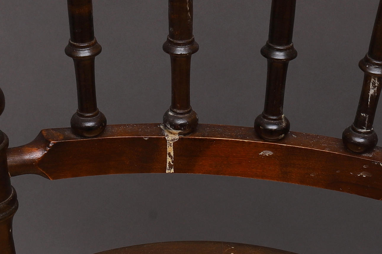 Slitage. Lättare sprickor på undersidan av sitsar. En stol med något större skada i sitsen.