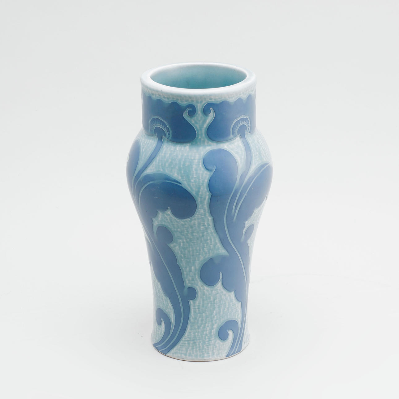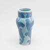 Dekor av blå blommor mot ljusare blå botten. Märkt "Gustavsberg 1920 JE". Höjd ca 29 cm.