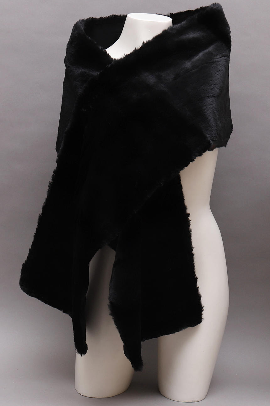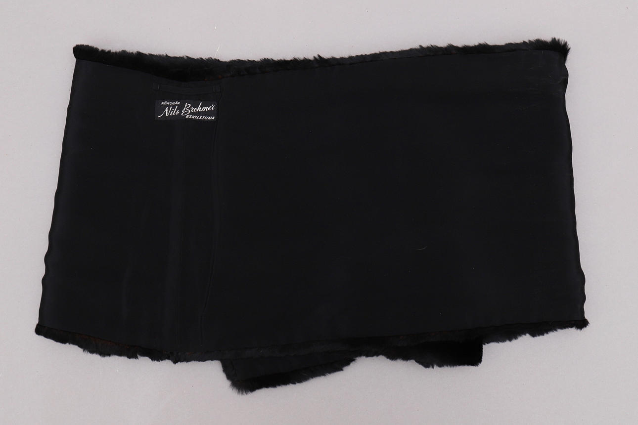 Krage, svart korthårig mjuk päls, etikett körsnär Nils Brehmer Eskilstuna, längd ca 200 cm, bredd ca 31 cm.